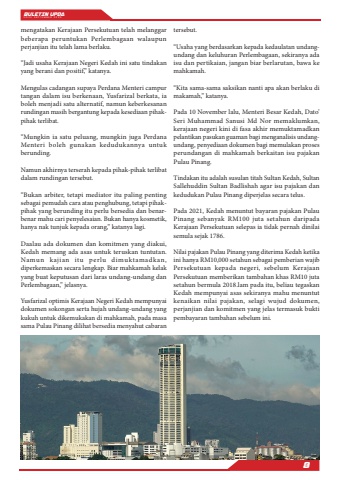 BULETIN UPDA EDISI SEPTEMBER 20258mengatakan Kerajaan Persekutuan telah melanggar beberapa peruntukan Perlembagaan walaupun perjanjian itu telah lama berlaku.%u201cJadi usaha Kerajaan Negeri Kedah ini satu tindakan yang berani dan positif,%u201d katanya.Mengulas cadangan supaya Perdana Menteri campur tangan dalam isu berkenaan, Yusfarizal berkata, ia boleh menjadi satu alternatif, namun keberkesanan rundingan masih bergantung kepada kesediaan pihakpihak terlibat.%u201cMungkin ia satu peluang, mungkin juga Perdana Menteri boleh gunakan kedudukannya untuk berunding.Namun akhirnya terserah kepada pihak-pihak terlibat dalam rundingan tersebut.%u201cBukan arbiter, tetapi mediator itu paling penting sebagai pemudah cara atau penghubung, tetapi pihakpihak yang berunding itu perlu bersedia dan benarbenar mahu cari penyelesaian. Bukan hanya kosmetik, hanya nak tunjuk kepada orang,%u201d katanya lagi.Daalau ada dokumen dan komitmen yang diakui, Kedah memang ada asas untuk teruskan tuntutan. Namun kajian itu perlu dimuktamadkan, diperkemaskan secara lengkap. Biar mahkamah kelak yang buat keputusan dari laras undang-undang dan Perlembagaan,%u201d jelasnya.Yusfarizal optimis Kerajaan Negeri Kedah mempunyai dokumen sokongan serta hujah undang-undang yang kukuh untuk dikemukakan di mahkamah, pada masa sama Pulau Pinang dilihat bersedia menyahut cabaran tersebut.%u201cUsaha yang berdasarkan kepada kedaulatan undangundang dan keluhuran Perlembagaan, sekiranya ada isu dan pertikaian, jangan biar berlarutan, bawa ke mahkamah.%u201cKita sama-sama saksikan nanti apa akan berlaku di makamah,%u201d katanya.Pada 10 November lalu, Menteri Besar Kedah, Dato%u2019 Seri Muhammad Sanusi Md Nor memaklumkan, kerajaan negeri kini di fasa akhir memuktamadkan pelantikan pasukan guaman bagi menganalisis undangundang, penyediaan dokumen bagi memulakan proses perundangan di mahkamah berkaitan isu pajakan Pulau Pinang.Tindakan itu adalah susulan titah Sultan Kedah, Sultan Sallehuddin Sultan Badlishah agar isu pajakan dan kedudukan Pulau Pinang diperjelas secara telus.Pada 2021, Kedah menuntut bayaran pajakan Pulau Pinang sebanyak RM100 juta setahun daripada Kerajaan Persekutuan selepas ia tidak pernah dinilai semula sejak 1786.Nilai pajakan Pulau Pinang yang diterima Kedah ketika ini hanya RM10,000 setahun sebagai pemberian wajib Persekutuan kepada negeri, sebelum Kerajaan Persekutuan memberikan tambahan khas RM10 juta setahun bermula 2018.lam pada itu, beliau tegaskan Kedah mempunyai asas sekiranya mahu menuntut kenaikan nilai pajakan, selagi wujud dokumen, perjanjian dan komitmen yang jelas termasuk bukti pembayaran tambahan sebelum ini.