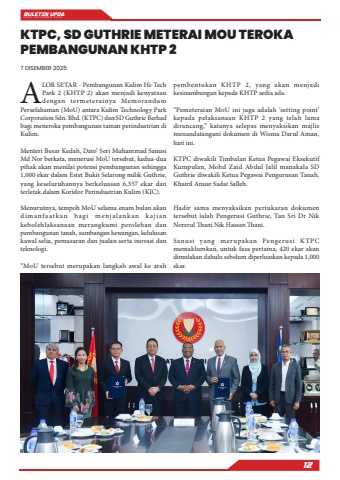 BULETIN UPDA EDISI SEPTEMBER 202512ALOR SETAR - Pembangunan Kulim Hi-Tech Park 2 (KHTP 2) akan menjadi kenyataan dengan termeterainya Memorandum Persefahaman (MoU) antara Kulim Technology Park Corporation Sdn. Bhd. (KTPC) dan SD Guthrie Berhad bagi meneroka pembangunan taman perindustrian di Kulim.Menteri Besar Kedah, Dato%u2019 Seri Muhammad Sanusi Md Nor berkata, menerusi MoU tersebut, kedua-dua pihak akan menilai potensi pembangunan sehingga 1,000 ekar dalam Estet Bukit Selarong milik Guthrie, yang keseluruhannya berkeluasan 6,357 ekar dan terletak dalam Koridor Perindustrian Kulim (KIC).Menurutnya, tempoh MoU selama enam bulan akan dimanfaatkan bagi menjalankan kajian kebolehlaksanaan merangkumi perolehan dan pembangunan tanah, sumbangan kewangan, kelulusan kawal selia, pemasaran dan jualan serta inovasi dan teknologi.%u201cMoU tersebut merupakan langkah awal ke arah pembentukan KHTP 2, yang akan menjadi kesinambungan kepada KHTP sedia ada.%u201cPemeteraian MoU ini juga adalah %u2018setting point%u2019 kepada pelaksanaan KHTP 2 yang telah lama dirancang,%u201d katanya selepas menyaksikan majlis menandatangani dokumen di Wisma Darul Aman, hari ini.KTPC diwakili Timbalan Ketua Pegawai Eksekutif Kumpulan, Mohd Zaid Abdul Jalil manakala SD Guthrie diwakili Ketua Pegawai Pengurusan Tanah, Khairil Anuar Sadat Salleh.Hadir sama menyaksikan pertukaran dokumen tersebut ialah Pengerusi Guthrie, Tan Sri Dr Nik Norzrul Thani Nik Hassan Thani.Sanusi yang merupakan Pengerusi KTPC memaklumkan, untuk fasa pertama, 420 ekar akan dimulakan dahulu sebelum diperluaskan kepada 1,000 ekar.KTPC, SD GUTHRIE METERAI MOU TEROKA PEMBANGUNAN KHTP 27 DISEMBER 2025