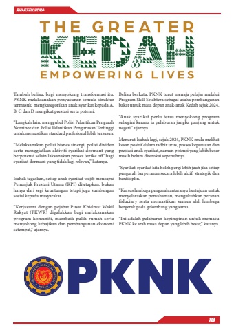 BULETIN UPDA EDISI SEPTEMBER 202518Tambah beliau, bagi menyokong transformasi itu, PKNK melaksanakan penyusunan semula struktur termasuk, mengkategorikan anak syarikat kepada A, B, C dan D mengikut prestasi serta potensi.%u201cLangkah lain, menggubal Polisi Pelantikan Pengarah Nominee dan Polisi Pelantikan Pengurusan Tertinggi untuk memastikan standard profesional lebih tersusun.%u201cMelaksanakan polisi bisnes sinergi, polisi dividen serta menggiatkan aktiviti syarikat dormant yang berpotensi selain laksanakan proses %u2018strike off %u2019 bagi syarikat dormant yang tidak lagi relevan,%u201d katanya.Isahak tegaskan, setiap anak syarikat wajib mencapai Penunjuk Prestasi Utama (KPI) ditetapkan, bukan hanya dari segi keuntungan tetapi juga sumbangan sosial kepada masyarakat.%u201cKerjasama dengan pejabat Pusat Khidmat Wakil Rakyat (PKWR) digalakkan bagi melaksanakan program komuniti, membaik pulih rumah serta menyokong kebajikan dan pembangunan ekonomi setempat,%u201d ujarnya.Beliau berkata, PKNK turut menaja pelajar melalui Program Skill Sejahtera sebagai usaha pembangunan bakat untuk masa depan anak-anak Kedah sejak 2024.%u201cAnak syarikat perlu terus menyokong program sebegini kerana ia pelaburan jangka panjang untuk negeri,%u201d ujarnya.Menurut Isahak lagi, sejak 2024, PKNK mula melihat kesan positif dalam tadbir urus, proses keputusan dan prestasi anak syarikat, namun potensi yang lebih besar masih belum diterokai sepenuhnya.%u201cSyarikat-syarikat kita boleh pergi lebih jauh jika setiap pengarah berperanan secara lebih aktif, strategik dan berdisiplin.%u201cKursus lembaga pengarah antaranya bertujuan untuk menyelaraskan pemahaman, mengukuhkan peranan fiduciary serta memastikan semua ahli lembaga bergerak pada gelombang yang sama.%u201cIni adalah pelaburan kepimpinan untuk memacu PKNK ke arah masa depan yang lebih besar,%u201d katanya.