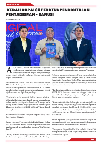 BULETIN UPDA EDISI SEPTEMBER 202519ALOR SETAR - Kedah kini mencapai 80 peratus pelaksanaan pendigitalan dalam sistem pentadbiran kerajaan negeri, menjadikannya antara negeri paling ke hadapan dalam transformasi digital sektor awam.Menteri Besar Kedah, Dato%u2019 Seri Muhammad Sanusi Md Nor berkata, pelaksanaan sistem perkhidmatan dalam talian sepenuhnya sektor awam (E2E) di Kedah membolehkan hampir semua urusan kerajaan negeri dijalankan secara digital sepenuhnya.%u201cDaripada mula sampai habis, semua digital. Alhamdulillah, saya rasa Kedah antara terkehadapan dalam usaha pendigitalan kerajaan,%u201d katanya pada sidang akhbar selepas majlis peluncuran Kedah Digital Blueprint 2025-2050 (KDBP 2050) di Wisma Darul Aman, hari ini.Hadir sama, Setiausaha Kerajaan Negeri Kedah, Dato%u2019 Seri Norizan Khazali.Sanusi yang juga Pengerusi Majlis Digital Negeri Kedah (MDNK) berkata, KDBP 2050 merupakan mekanisme penting untuk merealisasikan gagasan %u2018The Greater Kedah%u2019.%u201cSetiap inisiatif dicadangkan menerusi KDBP 2050 tidak terpesong dari visi Kedah Sejahtera dan Berdaya Huni serta misi memacu pembangunan sosioekonomi yang inklusif, berdaya saing dan mampan,%u201d katanya.Dalam ucapannya beliau memaklumkan, pendigitalan sektor kerajaan selaras dengan Teras 5 The Greater Kedah, iaitu Kompetensi Tadbir Urus yang menekankan perkhidmatan awam digital, Kedah tanpa tunai dan perkhidmatan lancar.%u201cTerdapat empat teras strategik disasarkan dalam KDBP 2050 bermula tahun ini hingga 2050, iaitu perkhidmatan digital, masyarakat digital, kerajaan digital serta teknologi terkedepan.%u201cSebanyak 49 inisiatif dirangka untuk menjadikan Kedah seiring dengan era digitalisasi. Ia akan dipantau melalui platform Dashboard KDBP2050, yang menyelaras hala tuju pendigitalan serta status pelaksanaan dan isu dibangkitkan agensi peneraju,%u201d ujar beliau.Sanusi tegaskan, pendigitalan bukan usaha singkat, ia memerlukan visi jelas, perancangan teliti, komitmen berterusan dan keberanian untuk berubah.%u201cBelanjawan Negeri Kedah 2026 melalui Inisiatif 40 memperuntukkan RM8.26 juta bagi memperkukuh transformasi digital. KEDAH CAPAI 80 PERATUS PENDIGITALAN PENTADBIRAN - SANUSI9 DISEMBER 2025