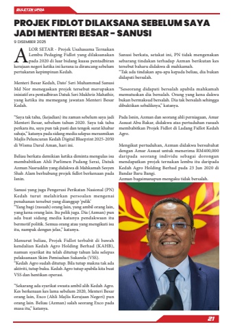 BULETIN UPDA EDISI SEPTEMBER 202521ALOR SETAR - Projek Usahasama Ternakan Lembu Pedaging Fidlot yang dilaksanakan pada 2020 di luar bidang kuasa pentadbiran kerajaan negeri ketika ini kerana ia dirancang sebelum pertukaran kepimpinan Kedah.Menteri Besar Kedah, Dato%u2019 Seri Muhammad Sanusi Md Nor menegaskan projek tersebut merupakan inisiatif era pentadbiran Datuk Seri Mukhriz Mahathir, yang ketika itu memegang jawatan Menteri Besar Kedah.%u201cSaya tak tahu, (kejadian) itu zaman sebelum saya jadi Menteri Besar, sebelum tahun 2020. Saya tak tahu perkara itu, saya pun tak pasti dan tengok surat khabar sahaja,%u201d katanya pada sidang media selepas merasmikan Majlis Peluncuran Kedah Digital Blueprint 2025-2050 di Wisma Darul Aman, hari ini.Beliau berkata demikian ketika diminta mengulas isu membabitkan Ahli Parlimen Padang Serai, Datuk Azman Nasruddin yang didakwa di Mahkamah Sesyen Shah Alam berhubung projek fidlot berkenaan pada Isnin.Sanusi yang juga Pengerusi Perikatan Nasional (PN) Kedah turut melahirkan persoalan mengenai penahanan tersebut yang dianggap %u2018pelik%u2019%u201cYang bagi (rasuah) orang lain, yang ambil orang lain, yang kena orang lain. Itu pelik juga. Dia (Azman) pun ada buat sidang media katanya pendakwaan itu bermotif politik. Semua orang atau yang mengikuti isu itu, nampak dengan jelas,%u201d katanya.Menurut beliau, Projek Fidlot terbabit di bawah kendalian Kedah Agro Holding Berhad (KAHB), namun syarikat itu telah ditutup tahun lalu selepas pelaksanaan Skim Pemisahan Sukarela (VSS).%u201cKedah Agro sudah ditutup. Bila tutup makna tak ada aktiviti, tutup buku. Kedah Agro tutup apabila kita buat VSS dan hentikan operasi.%u201dSekarang ada syarikat swasta ambil alih Kedah Agro. Kes berkenaan kes lama sebelum 2020, Menteri Besar orang lain, Exco (Ahli Majlis Kerajaan Negeri) pun orang lain. Beliau (Azman) salah seorang Exco pada masa itu,%u201d katanya.Sanusi berkata, setakat ini, PN tidak mengenakan sebarang tindakan terhadap Azman berikutan kes tersebut baharu didakwa di mahkamah.%u201cTak ada tindakan apa-apa kepada beliau, dia bukan didapati bersalah.%u201cSeseorang didapati bersalah apabila mahkamah memutuskan dia bersalah. Orang yang kena dakwa bukan bermaksud bersalah. Dia tak bersalah sehingga dibuktikan sebaliknya,%u201d katanya.Pada Isnin, Azman dan seorang ahli perniagaan, Amar Assuat Abu Bakar, didakwa atas pertuduhan rasuah membabitkan Projek Fidlot di Ladang Fidlot Kedah Agro.Mengikut pertuduhan, Azman didakwa bersubahat dengan Amar Assuat untuk menerima RM400,000 daripada seorang individu sebagai dorongan mendapatkan projek ternakan lembu itu daripada Kedah Agro Holding Berhad pada 23 Jun 2020 di Bandar Baru Bangi.Azman bagaimanapun mengaku tidak bersalah.PROJEK FIDLOT DILAKSANA SEBELUM SAYA JADI MENTERI BESAR - SANUSI9 DISEMBER 2025