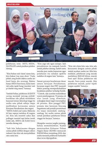 BULETIN UPDA EDISI SEPTEMBER 202523pelaburan, iaitu MITI, MIDA, MATRADE untuk pastikan pelabur datang.%u201cKita bukan nak %u2018claim%u2019 nama kita, kita bukan %u2018one man show%u2019. Tiada pihak yang boleh dakwa usaha ini hasil kerja dia seorang. Bukan hanya MIDA buat kerja, kalau kami tak sedia tapak hang (mereka) nak pi duduk tang mana,%u201d katanya.Tambah beliau, pelaburan di KHTP sering menjadi %u2018perang politik%u2019 berikutan ada pihak mendakwa kejayaan taman teknologi tinggi itu usaha satu pihak sahaja tanpa melibatkan kerjasama antara Kerajaan Persekutuan dan negeri.%u201cMIDA boleh jual nama Malaysia di luar supaya melabur di negara ini. Kita ada insentif cukai dan pelbagai insentif tapi kalau tanah tidak ada, MIDA tak boleh bawa mereka datang sini.%u201cJadi kita bekerjasama dengan semua pihak terlibat dengan sektor industri dan kita tak menyalahkan satu sama lain.%u201cKita juga tak ugut sesiapa. Jadi persekitaran itu nampak bersih untuk pelabur datang. Sudah tentu mereka pun mahu kepastian agar pelaburan itu selamat apabila melabur di negara lain,%u201d katanya.Sanusi percaya keselarasan dasar antara kerajaan Persekutuan, kerajaan negeri dan PBT menjadi faktor penting memperkukuhkan keyakinan pelabur terhadap Kedah.%u201cContoh, ada syarikat meletakkan syarat pembangunan 70 peratus di atas tanah yang dimohon, sedangkan dasar negeri menetapkan 60 peratus. Kita panggil PBT, pemaju dan kerajaan bincang bagaimana nak penuhi permintaan itu tanpa menyalahi undangundang. Ini usaha semua pihak untuk pastikan pelaburan bilion ringgit itu berjaya,%u201d katanya.Mengulas sasaran jangka panjang, beliau memaklumkan, Kedah menyasarkan Keluaran Dalam Negara Kasar (KDNK) mencecah RM500 bilion menjelang 2050, dan usaha menarik pelaburan berkualiti akan terus dipergiatkan.%u201cKita tak claim kita saja, kita ada kerjasama dengan semua pihak untuk jayakan usaha ini. Bila kita maklum, pelaburan yang masuk jumlahnya RM168 bilion, marah buat apa? Kalau pelaburan tak masuk, baru patut marah. Jika pelaburan masuk, patut tepuk tangan sajalah,%u201d katanya.