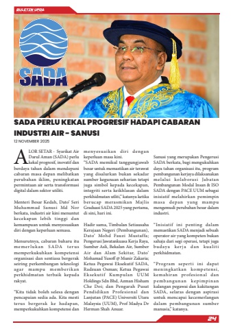 BULETIN UPDA EDISI SEPTEMBER 202524SADA PERLU KEKAL PROGRESIF HADAPI CABARAN INDUSTRI AIR - SANUSI12 NOVEMBER 2025ALOR SETAR - Syarikat Air Darul Aman (SADA) perlu kekal progresif, inovatif dan berdaya tahan dalam mendepani cabaran masa depan melibatkan perubahan iklim, peningkatan permintaan air serta transformasi digital dalam sektor utiliti.Menteri Besar Kedah, Dato%u2019 Seri Muhammad Sanusi Md Nor berkata, industri air kini menuntut kecekapan lebih tinggi dan kemampuan untuk menyesuaikan diri dengan keperluan semasa.Menurutnya, cabaran baharu itu me me rlu k an S A DA te r us memperkukuhkan kompetensi organisasi dan sentiasa bergerak seiring perkembangan teknologi agar mampu memb erikan perkhidmatan terbaik kepada rakyat.%u201cKita tidak boleh selesa dengan pencapaian sedia ada. Kita mesti terus bergerak ke hadapan, memperkukuhkan kompetensi dan menyesuaikan diri dengan keperluan masa kini.%u201cSADA memikul tanggungjawab besar untuk memastikan air terawat yang disalurkan bukan sekadar sumber kegunaan seharian tetapi juga simbol kepada kecekapan, integriti serta keikhlasan dalam perkhidmatan utliti,%u201d katanya ketika berucap merasmikan Majlis Graduasi SADA 2025 yang pertama, di sini, hari ini.Hadir sama, Timbalan Setiausaha Kerajaan Negeri (Pembangunan), Dato%u2019 Mohd Fauzi Mustaffa; Pengerusi Jawatankuasa Kerja Raya, Sumber Asli, Bekalan Air, Sumber Air dan Alam Sekitar, Dato%u2019 Mohamad Yusoff @ Munir Zakaria; Ketua Pegawai Eksekutif SADA, Radzuan Osman; Ketua Pegawai Eksekutif Kumpulan UUM Holdings Sdn Bhd, Azman Hisham Che Doi; dan Pengarah Pusat Pendidikan Profesional dan Lanjutan (PACE) Universiti Utara Malaysia (UUM), Prof Madya Dr Herman Shah Anuar.Sanusi yang merupakan Pengerusi SADA berkata, bagi mengukuhkan daya tahan organisasi itu, program pembangunan kerjaya dilaksanakan melalui kolaborasi Jabatan Pembangunan Modal Insan & ISO SADA dengan PACE UUM sebagai inisiatif melahirkan pemimpin masa depan yang mampu mengemudi perubahan besar dalam industri.%u201cInisiatif ini penting dalam memastikan SADA menjadi sebuah operator air yang kompeten bukan sahaja dari segi operasi, tetapi juga budaya ker ja dan kualiti perkhidmatan.%u201cProgram seperti ini dapat meningkatkan kompetensi, kemahiran profesional dan p embangunan kepimpinan kalangan pegawai dan kakitangan SADA, selaras dengan aspirasi untuk mencapai kecemerlangan dalam pembangunan sumber manusia,%u201d katanya.