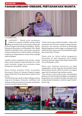 BULETIN UPDA EDISI SEPTEMBER 202528LANGKAWI %u2013 Wanita perlu mempunyai kefahaman yang jelas terhadap undang-undang bagi memastikan hak mereka sentiasa dilindungi.Menurut Pengerusi Jawatankuasa Kebajikan, Wanita, Keluarga & Masyarakat serta Perpaduan, Dato%u2019 Hajjah Halimaton Shaadiah Saad, wanita perlu memahami undang-undang kerana ia bukan sekadar melindungi, malah turut memperkasakan mereka dalam pelbagai aspek kehidupan.%u201cApabila wanita mengetahui hak mereka, mereka bukan sahaja mampu mempertahankan diri, malah boleh bertindak sebagai ejen perubahan dalam keluarga dan masyarakat,%u201d ujarnya.Beliau berkata demikian ketika merasmikan Konvensyen Wanita & Undang-Undang Peringkat Negeri Kedah 2025 di De Baron Resort, Kuah, di sini, hari ini.Tambah beliau lagi, masih terdapat pelbagai cabaran yang perlu ditangani, khususnya melibatkan hak undang-undang, kesejahteraan keluarga, keselamatan wanita serta akses kepada keadilan.%u201cDalam dunia yang semakin kompleks, wanita perlu memahami hak di bawah undang-undang keluarga, pekerjaan dan jenayah, termasuk perlindungan daripada keganasan rumah tangga, isu penjagaan anak, nafkah dan harta sepencarian serta keselamatan digital dan jenayah siber,%u201d katanya.Dalam pada itu, beliau berkata penganjuran konvensyen itu amat bertepatan selari dengan komitmen Kerajaan Negeri Kedah dalam membela hak serta perlindungan wanita.Beliau turut berharap konvensyen itu dapat menghasilkan resolusi yang jelas dan praktikal untuk dikemukakan kepada pihak berwajib di peringkat negeri dan Persekutuan bagi tindakan susulan.%u201cSaya menyeru semua peserta agar memanfaatkan platform ini untuk bertukar pandangan, meningkatkan pengetahuan serta membina jaringan sokongan demi memperkukuh kedudukan wanita di negeri Kedah,%u201d katanya lagi.FAHAMI UNDANG-UNDANG, PERTAHAN HAK WANITA13 DISEMBER 2025
