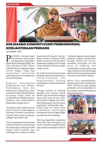 BULETIN UPDA EDISI SEPTEMBER 202529PENDANG - Kerajaan negeri menekankan kepentingan kerjasama antara masyarakat, Majlis Ketua Kampung (MKK) dan Pusat Khidmat Wakil Rakyat (PKWR) Dewan Undangan Negeri (DUN) Sungai Tiang bagi m e m a s t i k a n k e l a n c a r a n pembangunan serta kesejahteraan di daerah Pendang.P e n g e r u s i J a w a t a n k u a s a Pembangunan Luar Bandar, Pe mb ang u n an Ins an d an Pembasmian Kemiskinan, Dato%u2019 Ustazah Siti Ashah Ghazali berkata, kerjasama semua pihak ini membolehkan pelbagai program komuniti dan pembangunan dilaksanakan dengan lancar.%u201cKerjasama semua pihak menjadi kunci kejayaan pembangunan Pendang, termasuk kemudahan hospital, jalan empat lorong dan pelbagai infrastruktur lain.%u201cKetua kampung perlu memantau keadaan di kawasan masing-masing dan melaporkan sebarang masalah kepada pihak berkuasa agar pembangunan memberi manfaat kepada seluruh komuniti,%u201d ujarnya.Beliau berkata demikian ketika Majlis Perasmian Hari Komuniti Kampungku Sejahtera DUN Sungai Tiang, di Masjid Al-Munira, Sungai Tiang, hari ini.Siti Ashah turut menyeru komuniti kampung untuk terus bekerjasama, t o l o n g - m e n o l o n g d a n m e m a n f a a t k a n p e l u a n g pembangunan untuk kesejahteraan bersama.%u201cDengan inisiatif ini, Pendang dijangka terus menjadi contoh daerah maju dan harmoni dengan masyarakat yang bersatu padu, infrastruktur lengkap serta nilainilai kekeluargaan dan kerjasama yang kukuh,%u201d tambah beliau lagi.Dalam pada itu, beliau turut m e n e k a n k a n k e p e nt i n g a n kesejahteraan rumah tangga sebagai asas keharmonian kampung.%u201cIbu bapa digalakkan memantau anak-anak bagi menangani isu sosial, termasuk penagihan dadah yang semakin meningkat di daerah ini.%u201cSatu kisah inspirasi yang mendapat perhatian, apabila seorang bekas penagih dadah kini berjaya membuka perniagaan roti dan d on at d i k a mpu n g . D i a membuktikan sesiapa sahaja yang ingin berubah dan berusaha dengan tekad boleh menyumbang kepada komuniti secara positif,%u201d katanya.Beliau turut memaklumkan, kerajaan negeri telah memberikan lebih 7,000 geran tanah kepada penduduk serta menyediakan lot perumahan untuk pembangunan Kampung Sejahtera.KERJASAMA KOMUNITI KUNCI PEMBANGUNAN, KESEJAHTERAAN PENDANG13 DISEMBER 2025