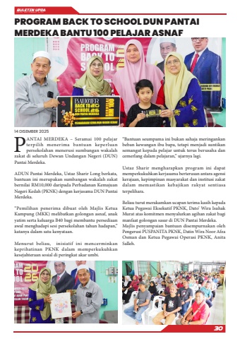 BULETIN UPDA EDISI SEPTEMBER 202530PANTAI MERDEKA %u2013 Seramai 100 pelajar terpilih menerima bantuan keperluan persekolahan menerusi sumbangan wakalah zakat di seluruh Dewan Undangan Negeri (DUN) Pantai Merdeka.ADUN Pantai Merdeka, Ustaz Sharir Long berkata, bantuan ini merupakan sumbangan wakalah zakat bernilai RM10,000 daripada Perbadanan Kemajuan Negeri Kedah (PKNK) dengan kerjasama DUN Pantai Merdeka.%u201cPemilihan penerima dibuat oleh Majlis Ketua Kampung (MKK) melibatkan golongan asnaf, anak yatim serta keluarga B40 bagi membantu persediaan awal menghadapi sesi persekolahan tahun hadapan,%u201d katanya dalam satu kenyataan.Menurut beliau, inisiatif ini mencerminkan keprihatinan PKNK dalam memperkukuhkan kesejahteraan sosial di peringkat akar umbi.%u201cBantuan seumpama ini bukan sahaja meringankan beban kewangan ibu bapa, tetapi menjadi suntikan semangat kepada pelajar untuk terus berusaha dan cemerlang dalam pelajaran,%u201d ujarnya lagi.Ustaz Sharir mengharapkan program ini dapat memperkukuhkan kerjasama berterusan antara agensi kerajaan, kepimpinan masyarakat dan institusi zakat dalam memastikan kebajikan rakyat sentiasa terpelihara. Beliau turut merakamkan ucapan terima kasih kepada Ketua Pegawai Eksekutif PKNK, Dato%u2019 Wira Isahak Murat atas komitmen menyalurkan agihan zakat bagi manfaat golongan sasar di DUN Pantai Merdeka.Majlis penyampaian bantuan disempurnakan oleh Pengerusi PUSPANITA PKNK, Datin Wira Noor Afza Osman dan Ketua Pegawai Operasi PKNK, Anita Salleh.PROGRAM BACK TO SCHOOL DUN PANTAI MERDEKA BANTU 100 PELAJAR ASNAF14 DISEMBER 2025