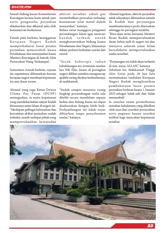 BULETIN UPDA EDISI SEPTEMBER 202533bawah bidang kuasa Kementerian Kewangan kerana lesen untuk ejen serta pengusaha perjudian dikeluarkan dan dikawal selia oleh kementerian berkenaan.Faizah pula berkata, keengganan K e r a j a a n N e g e r i K e d a h memperbaharui lesen premis perjudian menceroboh kuasa Persekutuan dan menjejaskan kuasa Menteri Kewangan di bawah Akta Pertaruhan Wang Terkumpul.Sementara Azizah berkata, rayuan itu sepatutnya dibenarkan kerana kerajaan negeri membuat keputusan itu atas dasar awam.Ahmad yang juga Ketua Dewan Ulama Pas Pusat (DUPP) menegaskan, ia suatu keputusan yang mendukacitakan rakyat Kedah khususnya umat Islam di negeri ini.%u201cMeskipun pelbagai keburukan dan kerosakan akibat perjudian sudah terbukti, masih terdapat pihak yang mempertahankan kewujudan aktiviti tersebut, sekali gus menimbulkan persoalan terhadap keutamaan nilai moral dalam masyarakat,%u201d katanya.Beliau turut menggesa pengamal perundangan Islam agar mencari k a e d a h t e r b a i k u n t u k mengharmonikan bidang kuasa Persekutuan dan Negeri, khususnya dalam perkara berkaitan syariat dan moral.%u201c S e j a k b e b e r a p a t a h u n kebelakangan ini, termasuk susulan kes Nik Elin, kuasa di peringkat negeri dilihat semakin menguncup apabila sering dicabar keabsahannya di mahkamah.%u201cSudah sampai masanya ruang lingkup perundangan sedia ada diteliti secara mendalam supaya kedua-dua bidang kuasa ini dapat diselaraskan dengan lebih baik. Perkembangan ini tidak wajar dibiarkan tanpa penyelesaian tuntas,%u201d katanya.Ahmad tegaskan, aktiviti perjudian tidak selayaknya dibenarkan semula di Kedah dan perjuangan membanterasnya perlu diteruskan sehingga ke peringkat terakhir.%u201cKita akan terus bersama Menteri Besar Kedah mempertahankan dasar bebas judi di negeri ini dan menyeru seluruh umat Islam bersolidariti mempertahankan usaha tersebut.%u201cPerjuangan ini tidak akan terhenti di sini, insya-ALLAH,%u201d katanya.Sebelum ini, Mahkamah Tinggi Alor Setar pada 20 Jun lalu memutuskan tindakan Kerajaan Negeri Kedah menghentikan pembaharuan lesen premis perjudian berkuat kuasa 1 Januari 2023 sebagai %u2018tidak sah%u2019 dan %u2018tidak munasabah%u2019.Ia susulan enam permohonan semakan kehakiman yang difailkan oleh ejen dan syarikat pertaruhan serta pegawai kanan syarikat terlibat bagi mencabar keputusan tersebut.