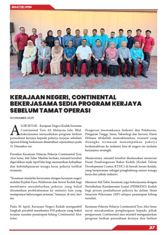 BULETIN UPDA EDISI SEPTEMBER 202537ALOR SETAR - Kerajaan Negeri Kedah bersama Continental Tyre AS Malaysia Sdn. Bhd. bekerjasama menyediakan program latihan persediaan kerjaya kepada pekerja terjejas sebelum operasi kilang berkenaan ditamatkan sepenuhnya pada 31 Disember ini.Presiden Kesatuan Pekerja-Pekerja Continental Tyre Alor Setar, Md Tahir Muslim berkata, inisiatif tersebut digerakkan sejak April lalu bagi memastikan kebajikan dan kebolehpasaran tenaga kerja pekerja terlibat terjamin.%u201cKesatuan menjalin kerjasama dengan kerajaan negeri melalui Pejabat Exco Pelaburan dan Invest Kedah bagi membantu mendaftarkan pekerja yang bakal ditamatkan perkhidmatan ke industri lain yang mempunyai kekosongan jawatan,%u201d katanya, di sini, hari ini.Pada 30 April, Kerajaan Negeri Kedah mengambil langkah proaktif membantu 950 pekerja yang bakal terjejas susulan penutupan kilang Continental Alor Setar.Pengerusi Jawatankuasa Industri dan Pelaburan, Pengajian Tinggi, Sains, Teknologi dan Inovasi, Haim Hilman Abdullah memaklumkan, inisiatif yang dirangka termasuk menempatkan pekerja berkemahiran ke industri lain di negeri ini melalui kerjasama strategik.Menurutnya, inisiatif tersebut diselaraskan menerusi Pusat Pembangunan Bakat Kedah (Kedah Talent Development Center, KTDC) di bawah Invest Kedah, yang berperanan sebagai penghubung antara tenaga kerja dan pihak industri.Menurut Md Tahir, kesatuan juga bekerjasama dengan Pertubuhan Keselamatan Sosial (PERKESO) Kedah bagi proses pendaftaran pekerja ke dalam Skim Insurans Pekerjaan (SIP) selepas penutupan kilang tersebut.Kesatuan Pekerja-Pekerja Continental Tyre Alor Setar turut merakamkan penghargaan kepada pihak pengurusan Continental atas inisiatif menganjurkan program latihan persediaan kerjaya dan latihan KERAJAAN NEGERI, CONTINENTAL BEKERJASAMA SEDIA PROGRAM KERJAYA SEBELUM TAMAT OPERASI18 DISEMBER 2025