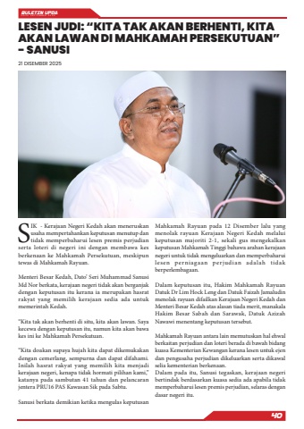 BULETIN UPDA EDISI SEPTEMBER 202540SIK - Kerajaan Negeri Kedah akan meneruskan usaha mempertahankan keputusan menutup dan tidak memperbaharui lesen premis perjudian serta loteri di negeri ini dengan membawa kes berkenaan ke Mahkamah Persekutuan, meskipun tewas di Mahkamah Rayuan.Menteri Besar Kedah, Dato%u2019 Seri Muhammad Sanusi Md Nor berkata, kerajaan negeri tidak akan berganjak dengan keputusan itu kerana ia merupakan hasrat rakyat yang memilih kerajaan sedia ada untuk memerintah Kedah.%u201cKita tak akan berhenti di situ, kita akan lawan. Saya kecewa dengan keputusan itu, namun kita akan bawa kes ini ke Mahkamah Persekutuan.%u201cKita doakan supaya hujah kita dapat dikemukakan dengan cemerlang, sempurna dan dapat difahami. Inilah hasrat rakyat yang memilih kita menjadi kerajaan negeri, kenapa tidak hormati pilihan kami,%u201d katanya pada sambutan 41 tahun dan pelancaran jentera PRU16 PAS Kawasan Sik pada Sabtu.Sanusi berkata demikian ketika mengulas keputusan Mahkamah Rayuan pada 12 Disember lalu yang menolak rayuan Kerajaan Negeri Kedah melalui keputusan majoriti 2-1, sekali gus mengekalkan keputusan Mahkamah Tinggi bahawa arahan kerajaan negeri untuk tidak mengeluarkan dan memperbaharui lesen perniagaan perjudian adalah tidak berperlembagaan.Dalam keputusan itu, Hakim Mahkamah Rayuan Datuk Dr Lim Hock Leng dan Datuk Faizah Jamaludin menolak rayuan difailkan Kerajaan Negeri Kedah dan Menteri Besar Kedah atas alasan tiada merit, manakala Hakim Besar Sabah dan Sarawak, Datuk Azizah Nawawi menentang keputusan tersebut.Mahkamah Rayuan antara lain memutuskan hal ehwal berkaitan perjudian dan loteri berada di bawah bidang kuasa Kementerian Kewangan kerana lesen untuk ejen dan pengusaha perjudian dikeluarkan serta dikawal selia kementerian berkenaan.Dalam pada itu, Sanusi tegaskan, kerajaan negeri bertindak berdasarkan kuasa sedia ada apabila tidak memperbaharui lesen premis perjudian, selaras dengan dasar negeri itu.LESEN JUDI: %u201cKITA TAK AKAN BERHENTI, KITA AKAN LAWAN DI MAHKAMAH PERSEKUTUAN%u201d - SANUSI21 DISEMBER 2025