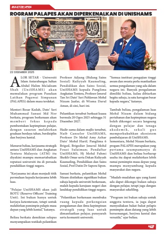 BULETIN UPDA EDISI SEPTEMBER 202542ALOR SETAR - Universiti Islam Antarabangsa Sultan Abdul Halim Mu%u2019adzam S h a h ( Un i S HA M S ) a k a n memulakan program Pasukan Latihan Pegawai Simpanan (PALAPES) dalam masa terdekat.Menteri Besar Kedah, Dato%u2019 Seri Muhammad Sanusi Md Nor berkata, program berkenaan akan m e m b e r i f o k u s k e p a d a pembentukan kepimpinan pelajar, dengan sasaran melahirkan graduan berdaya tahan, berdisiplin dan berjiwa kental.Menurut beliau, kerjasama strategik antara UniSHAMS dan Angkatan Tentera Malaysia (ATM) itu diyakini mampu memartabatkan reputasi universiti itu di persada pendidikan tinggi negara.%u201cKerjasama ini akan menjadi titik permulaan kepada kerjasama lebih luas.%u201cPelajar UniSHAMS akan jadi ROTU (Reserve Officers%u2019 Training Unit). Ini bukan hanya untuk kerjaya ketenteraan, tetapi untuk melahirkan pemimpin pelapis masa depan yang lebih kental,%u201d katanya.Beliau berkata demikian selepas menyampaikan watikah pelantikan Profesor Adjung (Bidang Sains Sosial) Kuliyyah Kaunseling, Pendidikan dan Sains Sosial, UniSHAMS kepada Panglima Angkatan Tentera, Profesor Jeneral Tan Sri Dato%u2019 Seri Pahlawan Mohd Nizam Jaafar, di Wisma Darul Aman, di sini, hari ini.Pelantikan tersebut berkuat kuasa bermula 20 Ogos 2025 sehingga 31 Disember 2027.Hadir sama dalam majlis tersebut, Naib Canselor UniSHAMS, Profesor Dr Mohd Amy Azhar Dato%u2019 Mohd Harif; Panglima 6 Briged, Brigedier Jeneral Mohd Fouzi Sulaiman; Pendaftar UniSHAMS, Hj Mohd Fahmi Sheikh Omar serta Dekan Kuliyyah Kaunseling, Pendidikan dan Sains Sosial, Prof Datin Dr Sapora Sipon.Sanusi berkata, pelantikan Mohd Nizam disifatkan signifikan bukan sahaja kepada universiti berkenaan, malah kepada kerajaan negeri dan landskap pendidikan tinggi negara.%u201cPelantikan berkenaan membuka ruang kepada perkongsian pengalaman dan ilmu kepimpinan strategik yang luas untuk dimanfaatkan pelajar, pensyarah serta komuniti universiti.%u201cSemua institusi pengajian tinggi awam dan swasta perlu manfaatkan semua pengalaman yang ada dalam negara ini. Banyak pengalaman dimiliki beliau, kalau dibiarkan begitu sahaja, ia satu kerugian besar kepada negara,%u201d katanya.Tambah beliau, pengalaman luas Mohd Nizam dalam bidang pertahanan dan kepimpinan negara boleh dikongsi secara langsung dengan pelajar dan tenaga a k a d e m i k , s e k a l i g u s memperkukuhkan ekosistem pembelajaran di UniSHAMS.Sementara, Mohd Nizam berkata, progam PALAPES merupakan yang per tama seumpamanya di UniSHAMS dan beliau berharap usaha itu dapat melahirkan lebih ramai pemimpin masa depan yang mampu menyumbang kepada masyarakat dan negara.%u201cMudah-mudahan apa yang kami ada dapat dikongsi bukan sahaja dengan pelajar, tetapi juga dengan masyarakat sekeliling.%u201cProgram ini bukan sahaja untuk anggota tentera, ia juga dapat menyediakan bakat-bakat pelapis pemimpin akan datang yang lebih bersemangat, berjiwa kental dan versatile,%u201d ujar beliau.ROGRAM PALAPES AKAN DIPERKENALKAN DI UNISHAMS22 DISEMBER 2025