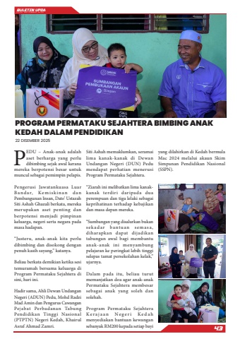 BULETIN UPDA EDISI SEPTEMBER 202543PEDU %u2013 Anak-anak adalah aset berharga yang perlu dibimbing sejak awal kerana mereka berpotensi besar untuk muncul sebagai pemimpin pelapis.Pengerusi Jawatankuasa Luar B an d ar, Ke m i s k i n an d an Pembangunan Insan, Dato%u2019 Ustazah Siti Ashah Ghazali berkata, mereka merupakan aset penting dan berpotensi menjadi pimpinan keluarga, negeri serta negara pada masa hadapan.%u201cJusteru, anak-anak kita perlu dibimbing dan disokong dengan penuh kasih sayang,%u201d katanya.Beliau berkata demikian ketika sesi temuramah bersama keluarga di Program Permataku Sejahtera di sini, hari ini.Hadir sama, Ahli Dewan Undangan Negeri (ADUN) Pedu, Mohd Radzi Mad Amin dan Pengurus Cawangan Pejabat Perbadanan Tabung Pendidikan Tinggi Nasional (PTPTN) Negeri Kedah, Khairul Asraf Ahmad Zamri.Siti Ashah memaklumkan, seramai lima kanak-kanak di Dewan Undangan Negeri (DUN) Pedu mendapat perhatian menerusi Program Permataku Sejahtera.%u201cZiarah ini melibatkan lima kanakkanak terdiri daripada dua perempuan dan tiga lelaki sebagai keprihatinan terhadap kebajikan dan masa depan mereka.%u201cSumbangan yang disalurkan bukan s ek a d ar b antu an s e mas a , diharapkan dapat dijadikan tabungan awal bagi membantu anak-anak ini menyambung pelajaran ke peringkat lebih tinggi selepas tamat persekolahan kelak,%u201d ujarnya.Dalam pada itu, beliau turut memanjatkan doa agar anak-anak Permataku Sejahtera membesar sebagai anak yang soleh dan solehah.Program Permataku Sejahtera K e r a j a a n N e g e r i K e d a h menyediakan bantuan kewangan sebanyak RM200 kepada setiap bayi yang dilahirkan di Kedah bermula Mac 2024 melalui akaun Skim Simpanan Pendidikan Nasional (SSPN).PROGRAM PERMATAKU SEJAHTERA BIMBING ANAK KEDAH DALAM PENDIDIKAN22 DISEMBER 2025