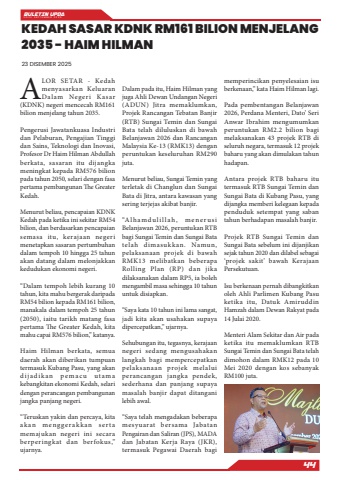 BULETIN UPDA EDISI SEPTEMBER 202544ALOR SETAR - Kedah menyasarkan Keluaran Dalam Negeri Kasar (KDNK) negeri mencecah RM161 bilion menjelang tahun 2035.Pengerusi Jawatankuasa Industri dan Pelaburan, Pengajian Tinggi dan Sains, Teknologi dan Inovasi, Profesor Dr Haim Hilman Abdullah berkata, sasaran itu dijangka meningkat kepada RM576 bilion pada tahun 2050, selari dengan fasa pertama pembangunan The Greater Kedah.Menurut beliau, pencapaian KDNK Kedah pada ketika ini sekitar RM54 bilion, dan berdasarkan pencapaian semasa itu, kerajaan negeri menetapkan sasaran pertumbuhan dalam tempoh 10 hingga 25 tahun akan datang dalam melonjakkan kedudukan ekonomi negeri.%u201cDalam tempoh lebih kurang 10 tahun, kita mahu bergerak daripada RM54 bilion kepada RM161 bilion, manakala dalam tempoh 25 tahun (2050), iaitu tarikh matang fasa pertama The Greater Kedah, kita mahu capai RM576 bilion,%u201d katanya.Haim Hilman berkata, semua daerah akan diberikan tumpuan termasuk Kubang Pasu, yang akan d ij a d i k an p e m a c u ut am a kebangkitan ekonomi Kedah, selari dengan perancangan pembangunan jangka panjang negeri.%u201cTeruskan yakin dan percaya, kita akan menggerakkan ser ta memajukan negeri ini secara berperingkat dan berfokus,%u201d ujarnya.Dalam pada itu, Haim Hilman yang juga Ahli Dewan Undangan Negeri (ADUN) Jitra memaklumkan, Projek Rancangan Tebatan Banjir (RTB) Sungai Temin dan Sungai Bata telah diluluskan di bawah Belanjawan 2026 dan Rancangan Malaysia Ke-13 (RMK13) dengan peruntukan keseluruhan RM290 juta.Menurut beliau, Sungai Temin yang terletak di Changlun dan Sungai Bata di Jitra, antara kawasan yang sering terjejas akibat banjir.%u201cA l h am du l i l l a h , m e n e r u s i Belanjawan 2026, peruntukan RTB bagi Sungai Temin dan Sungai Bata telah dimasukkan. Namun, pelaksanaan projek di bawah RMK13 melibatkan beberapa Rolling Plan (RP) dan jika dilaksanakan dalam RP5, ia boleh mengambil masa sehingga 10 tahun untuk disiapkan.%u201cSaya kata 10 tahun ini lama sangat, jadi kita akan usahakan supaya dipercepatkan,%u201d ujarnya.Sehubungan itu, tegasnya, kerajaan negeri sedang mengusahakan langkah bagi mempercepatkan pelaksanaan projek melalui perancangan jangka pendek, sederhana dan panjang supaya masalah banjir dapat ditangani lebih awal.%u201cSaya telah mengadakan beberapa mesyuarat bersama Jabatan Pengairan dan Saliran (JPS), MADA dan Jabatan Kerja Raya (JKR), termasuk Pegawai Daerah bagi memperincikan penyelesaian isu berkenaan,%u201d kata Haim Hilman lagi.Pada pembentangan Belanjawan 2026, Perdana Menteri, Dato%u2019 Seri Anwar Ibrahim mengumumkan peruntukan RM2.2 bilion bagi melaksanakan 43 projek RTB di seluruh negara, termasuk 12 projek baharu yang akan dimulakan tahun hadapan.Antara projek RTB baharu itu termasuk RTB Sungai Temin dan Sungai Bata di Kubang Pasu, yang dijangka memberi kelegaan kepada penduduk setempat yang saban tahun berhadapan masalah banjir.Projek RTB Sungai Temin dan Sungai Bata sebelum ini dijanjikan sejak tahun 2020 dan dilabel sebagai %u2018projek sakit%u2019 bawah Kerajaan Persekutuan.Isu berkenaan pernah dibangkitkan oleh Ahli Parlimen Kubang Pasu ketika itu, Datuk Amiruddin Hamzah dalam Dewan Rakyat pada 14 Julai 2020.Menteri Alam Sekitar dan Air pada ketika itu memaklumkan RTB Sungai Temin dan Sungai Bata telah dimohon dalam RMK12 pada 10 Mei 2020 dengan kos sebanyak RM100 juta.KEDAH SASAR KDNK RM161 BILION MENJELANG 2035 - HAIM HILMAN23 DISEMBER 2025