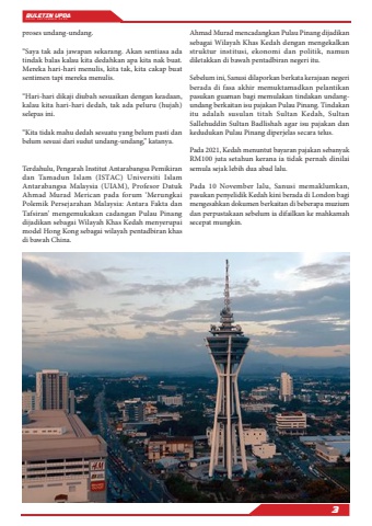 BULETIN UPDA EDISI SEPTEMBER 20253proses undang-undang.%u201cSaya tak ada jawapan sekarang. Akan sentiasa ada tindak balas kalau kita dedahkan apa kita nak buat. Mereka hari-hari menulis, kita tak, kita cakap buat sentimen tapi mereka menulis.%u201cHari-hari dikaji diubah sesuaikan dengan keadaan, kalau kita hari-hari dedah, tak ada peluru (hujah) selepas ini. %u201cKita tidak mahu dedah sesuatu yang belum pasti dan belum sesuai dari sudut undang-undang,%u201d katanya.Terdahulu, Pengarah Institut Antarabangsa Pemikiran dan Tamadun Islam (ISTAC) Universiti Islam Antarabangsa Malaysia (UIAM), Profesor Datuk Ahmad Murad Merican pada forum %u2018Merungkai Polemik Persejarahan Malaysia: Antara Fakta dan Tafsiran%u2019 mengemukakan cadangan Pulau Pinang dijadikan sebagai Wilayah Khas Kedah menyerupai model Hong Kong sebagai wilayah pentadbiran khas di bawah China.Ahmad Murad mencadangkan Pulau Pinang dijadikan sebagai Wilayah Khas Kedah dengan mengekalkan struktur institusi, ekonomi dan politik, namun diletakkan di bawah pentadbiran negeri itu.Sebelum ini, Sanusi dilaporkan berkata kerajaan negeri berada di fasa akhir memuktamadkan pelantikan pasukan guaman bagi memulakan tindakan undangundang berkaitan isu pajakan Pulau Pinang. Tindakan itu adalah susulan titah Sultan Kedah, Sultan Sallehuddin Sultan Badlishah agar isu pajakan dan kedudukan Pulau Pinang diperjelas secara telus.Pada 2021, Kedah menuntut bayaran pajakan sebanyak RM100 juta setahun kerana ia tidak pernah dinilai semula sejak lebih dua abad lalu.Pada 10 November lalu, Sanusi memaklumkan, pasukan penyelidik Kedah kini berada di London bagi mengesahkan dokumen berkaitan di beberapa muzium dan perpustakaan sebelum ia difailkan ke mahkamah secepat mungkin.