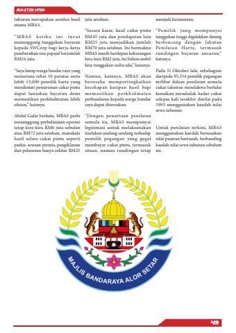 BULETIN UPDA EDISI SEPTEMBER 202549taksiran merupakan sumber hasil utama MBAS.%u201cM BA S ke t i k a i n i tu r ut menanggung tunggakan bayaran kepada SWCorp bagi kerja-kerja pembersihan sisa pepejal berjumlah RM24 juta.%u201cSaya harap warga bandar raya yang menerima rebat 10 peratus serta lebih 13,000 pemilik harta yang menikmati penurunan cukai pintu dapat lunaskan bayaran demi memastikan perkhidmatan lebih efisien,%u201d katanya.Abdul Gafar berkata, MBAS perlu menanggung perbelanjaan operasi tetap kira-kira RM6 juta sebulan atau RM72 juta setahun, manakala hasil selain cukai pintu seperti parkir, sewaan premis, pengiklanan dan pelesenan hanya sekitar RM25 juta setahun.%u201cSecara kasar, hasil cukai pintu RM45 juta dan pendapatan lain RM25 juta menjadikan jumlah RM70 juta setahun. Ini bermakna MBAS masih berdepan kekurangan kira-kira RM2 juta, itu belum ambil kira tunggakan sedia ada,%u201d katanya.Namun, katanya, MBAS akan berusaha mempertingkatkan kecekapan kutipan hasil bagi memastikan perkhidmatan perbandaran kepada warga bandar raya dapat diteruskan.%u201cDengan pewartaan penilaian semula itu, MBAS mempunyai legitimasi untuk melaksanakan tindakan undang-undang terhadap pemilik pegangan yang gagal membayar cukai pintu, termasuk sitaan, namun rundingan tetap menjadi keutamaan.%u201cPemilik yang mempunyai tunggakan tinggi digalakkan datang berbincang dengan Jabatan Penilaian Harta, termasuk rundingan bayaran ansuran,%u201d katanya.Pada 31 Oktober lalu, sebahagian daripada 95,354 pemilik pegangan terlibat dalam penilaian semula cukai taksiran mendakwa berlaku kenaikan mendadak kadar cukai selepas kali terakhir dinilai pada 1993 menggunakan kaedah nilai sewa tahunan.Untuk penilaian terkini, MBAS menggunakan kaedah berasaskan nilai pasaran hartanah, berbanding kaedah nilai sewa tahunan sebelum ini.