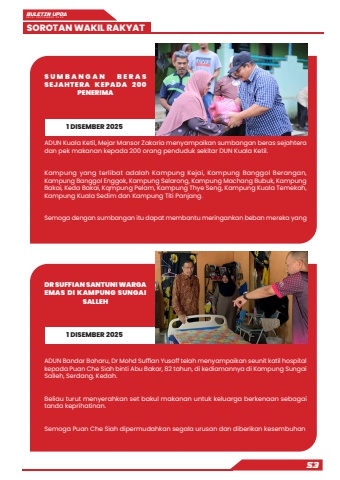 BULETIN UPDA EDISI SEPTEMBER 2025SOROTAN WAKIL RAKYAT53ADUN Kuala Ketil, Mejar Mansor Zakaria menyampaikan sumbangan beras sejahtera dan pek makanan kepada 200 orang penduduk sekitar DUN Kuala Ketil.Kampung yang terlibat adalah Kampung Kejai, Kampung Banggol Berangan, Kampung Banggol Enggok, Kampung Selarong, Kampung Machang Bubuk, Kampung Bakai, Keda Bakai, Kqmpung Pelam, Kampung Thye Seng, Kampung Kuala Temekah, Kampung Kuala Sedim dan Kampung Titi Panjang.Semoga dengan sumbangan itu dapat membantu meringankan beban mereka yang ADUN Bandar Baharu, Dr Mohd Suffian Yusoff telah menyampaikan seunit katil hospital kepada Puan Che Siah binti Abu Bakar, 82 tahun, di kediamannya di Kampung Sungai Salleh, Serdang, Kedah.Beliau turut menyerahkan set bakul makanan untuk keluarga berkenaan sebagai tanda keprihatinan.Semoga Puan Che Siah dipermudahkan segala urusan dan diberikan kesembuhanS U M B A N G A N B E R A S SEJAHTERA KEPADA 200 PENERIMADR SUFFIAN SANTUNI WARGA EMAS DI KAMPUNG SUNGAI SALLEH1 DISEMBER 20251 DISEMBER 2025