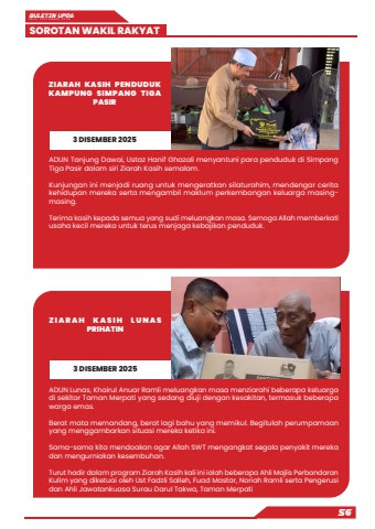 BULETIN UPDA EDISI SEPTEMBER 2025SOROTAN WAKIL RAKYAT56ADUN Tanjung Dawai, Ustaz Hanif Ghazali menyantuni para penduduk di Simpang Tiga Pasir dalam siri Ziarah Kasih semalam.Kunjungan ini menjadi ruang untuk mengeratkan silaturahim, mendengar cerita kehidupan mereka serta mengambil maklum perkembangan keluarga masingmasing.Terima kasih kepada semua yang sudi meluangkan masa. Semoga Allah memberkati usaha kecil mereka untuk terus menjaga kebajikan penduduk.ADUN Lunas, Khairul Anuar Ramli meluangkan masa menziarahi beberapa keluarga di sekitar Taman Merpati yang sedang diuji dengan kesakitan, termasuk beberapa warga emas.Berat mata memandang, berat lagi bahu yang memikul. Begitulah perumpamaan yang menggambarkan situasi mereka ketika ini.Sama-sama kita mendoakan agar Allah SWT mengangkat segala penyakit mereka dan mengurniakan kesembuhan.Turut hadir dalam program Ziarah Kasih kali ini ialah beberapa Ahli Majlis Perbandaran Kulim yang diketuai oleh Ust Fadzli Salleh, Fuad Mastar, Noriah Ramli serta Pengerusi dan Ahli Jawatankuasa Surau Darul Takwa, Taman MerpatiZIARAH KASIH PENDUDUK KAMPUNG SIMPANG TIGA PASIRZ I A R A H K A S I H L U N A S PRIHATIN3 DISEMBER 20253 DISEMBER 2025