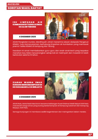 BULETIN UPDA EDISI SEPTEMBER 2025SOROTAN WAKIL RAKYAT57ADUN Pengkalan Kundor, Mardhiyyah Johari menerima aduan daripada Pengerusi KEMAS, Tuan Kamaruzzaman, berhubung limpahan air kumbahan yang memasuki premis Tadika KEMAS di Kampung Alor Terong.Keadaan ini amat membebankan guru-guru dan anak-anak kecil yang terpaksa menahan bau tidak menyenangkan setiap kali air melimpah dan masalah ini telah berlarutan selama 10 tahun.ADUN Pedu, Mohd Radzi Mad Amin bersama kakitangan Pusat Khidmat Wakil Rakyat DUN Pedu menziarahi warga emas yang kurang berkemampuan di Kampung Sukamari dan Kampung Berjaya, DUN Pedu.Semoga kunjungan ini membawa sedikit kegembiraan dan meringankan beban mereka.I S U L I M P A H A N A I R KUMBAHAN DI TADIKA KEMAS KG ALOR TERONGZ I A R A H W A R G A E M A S KURANG BERKEMAMPUAN DI KG SUKAMARI & KG BERJAYA4 DISEMBER 20254 DISEMBER 2025
