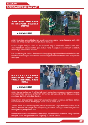 BULETIN UPDA EDISI SEPTEMBER 2025SOROTAN WAKIL RAKYAT58ADUN Belantek, Ahmad Sulaiman meninjau lampu solar yang dipasang oleh MKK Pekan Sik di tepi sungai Kampung Belukar Sampah.Pemasangan lampu solar ini diharapkan dapat memberi keselesaan dan meningkatkan keselamatan penduduk yang menggunakan laluan tersebut, khususnya pada waktu malam.Kos pemasangan lampu berkenaan ditanggung sepenuhnya oleh Pusat Khidmat DUN Belantek sebagai usaha berterusan meningkatkan kemudahan untuk masyarakat setempat.ADUN Derga, Muhamad Amri Wahab turut serta dalam program gotong-royong membersihkan kawasan di Taman Sri Taman bersama Dato%u2019 Dr. Chan, seorang physician dari Putra Medical Centre.Program ini dilaksanakan bagi memastikan kawasan kejiranan sentiasa dalam keadaan bersih, selesa dan terjaga untuk semua penduduk.Terima kasih diucapkan kepada para sukarelawan, Majlis Bandaraya Alor Setar (MBAS) dan IDAMAN yang turut turun padang memberi sokongan serta menyediakan kelengkapan pengurusan sisa.Kehadiran mereka melancarkan kerja-kerja pembersihan, termasuk pengumpulan sampah pukal dan pembersihan longkang di sekitar taman.ADUN TINJAU LAMPU SOLAR D I K A M P U N G B E L U K A R SAMPAHG O T O N G - R O Y O N G B E R S I H K A N T A M A N S R I T A M A N B E R S A M A A D U N DERGA4 DISEMBER 20254 DISEMBER 2025