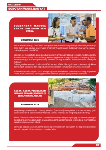 BULETIN UPDA EDISI SEPTEMBER 2025SOROTAN WAKIL RAKYAT62ADUN Kulim, Wong Chia Zhen menyampaikan Sumbangan kepada Mangsa Banjir DUN Kulim sesi kedua oleh Pusat Khidmat Wakil Rakyat DUN Kulim bersama rakanrakan korporat dan NGO.Sesi kali ini melibatkan para penduduk dari Kampung Padang Tembak, Padang Buloh, Taman Tunku Putra, Taman Tiong, Kampung Batu 4 Sungai Ular dan Kampung Terap.Antara yang turut menyumbang adalah Young Buddhist Association of Malaysia (YBAM).Sokongan berterusan daripada NGO seperti YBAM dihargai kerana ia menunjukkan semangat solidariti dan kepedulian masyarakat terhadap komuniti setempat.Tahniah kepada Majlis Ketua Kampung atas koordinasi dan usaha mengumpulkan maklumat penerima sehingga memudahkan proses penyerahan bantuan.Kerja-kerja pembaikan Lubang Benam (Sinkhole) oleh pihak JKR kini sedang giat dilaksanakan di jalan utama Padang Lembu menuju ke Simpang Bukit Kuang.ADUN Gurun, Baddrol Bakhtiar menasihatkan kepada para pengguna jalan raya agar bersabar dan menggunakan laluan alternatif buat sementara waktu bagi memastikan keselamatan semua pihak.Semoga segala urusan pembaikan dipermudahkan dan jalan ini dapat digunakan semula seperti biasa dalam masa terdekat.S U M B A N G A N M A N G S A BANJIR DUN KULIM SESI KEDUAKERJA-KERJA PEMBAIKAN LUBANG BENAM (SINKHOLE) SEDANG DIJALANKAN9 DISEMBER 20259 DISEMBER 2025