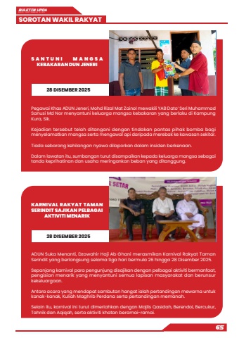BULETIN UPDA EDISI SEPTEMBER 2025SOROTAN WAKIL RAKYAT65Pegawai Khas ADUN Jeneri, Mohd Rizal Mat Zainol mewakili YAB Dato%u2019 Seri Muhammad Sanusi Md Nor menyantuni keluarga mangsa kebakaran yang berlaku di Kampung Kura, Sik.Kejadian tersebut telah ditangani dengan tindakan pantas pihak bomba bagi menyelamatkan mangsa serta mengawal api daripada merebak ke kawasan sekitar.Tiada sebarang kehilangan nyawa dilaporkan dalam insiden berkenaan.Dalam lawatan itu, sumbangan turut disampaikan kepada keluarga mangsa sebagai tanda keprihatinan dan usaha meringankan beban yang ditanggung.ADUN Suka Menanti, Dzowahir Haji Ab Ghani merasmikan Karnival Rakyat Taman Serindit yang berlangsung selama tiga hari bermula 26 hingga 28 Disember 2025.Sepanjang karnival para pengunjung disajikan dengan pelbagai aktiviti bermanfaat, pengisian menarik yang menyantuni semua lapisan masyarakat dan berunsur kekeluargaan.Antara acara yang mendapat sambutan hangat ialah pertandingan mewarna untuk kanak-kanak, Kuliah Maghrib Perdana serta pertandingan memanah.Selain itu, karnival ini turut dimeriahkan dengan Majlis Qasidah, Berendoi, Bercukur, Tahnik dan Aqiqah, serta aktiviti khatan beramai-ramai.S A N T U N I M A N G S A KEBAKARAN DUN JENERIKARNIVAL RAKYAT TAMAN SERINDIT SAJIKAN PELBAGAI AKTIVITI MENARIK28 DISEMBER 202528 DISEMBER 2025