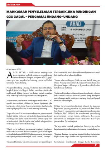 BULETIN UPDA EDISI SEPTEMBER 20257ALOR SETAR %u2013 Mahkamah merupakan penyelesaian terbaik sekiranya rundingan antara kerajaan dengan kerajaan (G2G) gagal mencapai kata sepakat berhubung tuntutan Kedah terhadap Pulau Pinang.Pengamal Undang-Undang, Yusfarizal Yussoff berkata, langkah Kerajaan Negeri Kedah membawa isu itu ke mahkamah dilihat berasas berikutan wujud penafian awal terhadap hak yang dikemukakan negeri itu.Menurutnya, walaupun rundingan melibatkan G2G masih merupakan pilihan, ia hanya berkesan jika kedua-dua pihak benar-benar jujur, ikhlas dan bersedia mencapai penyelesaian situasi menang-menang.%u201cSaya tidak rasakan mana-mana kerajaan pun termasuk Kedah terlalu berkeras untuk tidak berunding, tetapi rundingan itu perlu jujur dan ikhlas untuk capai %u2018win win situation%u2019. Jika daripada awal sudah ada penafian, memang sukar untuk berunding.%u201cBagi saya, sebagai pengamal undang-undang, mahkamah adalah kaedah terbaik jika rundingan peringkat eksekutif (G2G) tidak mencapai keputusan, walaupun proses itu nampak %u2018tidak cantik%u2019,%u201d katanya.Yusfarizal berkata, wajarlah sekiranya Kerajaan Negeri Kedah memilih untuk ke mahkamah kerana awal-awal lagi hak tersebut telah dinafikan.%u201cSama ada rundingan G2G (antara Kedah dengan Pulau Pinang) atau antara Kerajaan Persekutuan dan Kerajaan Negeri, akhirnya ia diputuskan oleh badan kehakiman,%u201d katanya.Yusfarizal jelaskan, dalam sistem demokrasi, cabang kehakiman adalah autoriti bebas yang menjadi penyelesaian akhir sekiranya cabang eksekutif gagal mencari jalan tengah.Beliau turut membandingkan situasi itu dengan keputusan penting sebelum ini, termasuk kes Sabah Law Society yang membawa isu pematuhan Perjanjian Malaysia 1963 (MA63) ke mahkamah berhubung pembayaran geran khas, sehingga Kerajaan Persekutuan didapati tidak menepati beberapa peruntukan Perlembagaan.%u201cIa juga satu bentuk perjanjian lama yang mahu keputusan daripada makamah tentang pematuhannya.%u201cKadang-kadang perjanjian lama dibiarkan berlarutan begitu lama tanpa diteliti dan dipatuhi secara teliti.Keputusan Mahkamah Tinggi Kota Kinabalu MAHKAMAH PENYELESAIAN TERBAIK JIKA RUNDINGAN G2G GAGAL - PENGAMAL UNDANG-UNDANG4 DISEMBER 2025