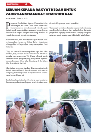 BULETIN UPDA EDISI OGOS 2025 8Pengerusi Pendidikan, Agama, Komunikasi dan Penerangan, YB Dato%u2019 Ustaz Mohd Azam Abd Samat menyeru kepada seluruh rakyat negeri Kedah untuk menunjukkan semangat kemerdekaan dan cintakan negara dengan memasang bendera di rumah dan premis-premis perniagaan.Menurut beliau, hari ini kerajaan negeri Kedah telah melancarkan kempen Kibar Jalur Gemilang sehinggalah 16 September yang merupakan Hari Malaysia.%u201cPagi ini kita telah menyampaikan sagu hati iaitu bendera, topi, air dan stiker kemerdekaan diberikan kepada para pengguna Tol Utara sebagai tanda simbolik untuk program yang dianjurkan,%u201d ujarnya semasa Kempen Kibar Jalur Gemilang di Tol Utara Alor Setar di sini, hari ini.Jelas beliau, program itu akan dijayakan di seluruh Kedah termasuklah di daerah-daerah, mukim dan kampung-kampung untuk menyemarakkan selama bulan kemerdekaan ini.Tambahnya lagi, beliau turut berharap agar kesedaran dan semangat kecintaan kepada tanah air akan turut dirasai oleh generasi muda masa kini.%u201cSemangat kecintaan kepada negara Malaysia yang merdeka bukan hanya dari sudut bebas daripada penjajahan tapi juga bebas minda kita juga daripada sebarang anasir-anasir yang tidak baik,%u201d kata beliau.SERUAN KEPADA RAKYAT KEDAH UNTUK ZAHIRKAN SEMANGAT KEMERDEKAANALOR SETAR - 6 OGOS 2025