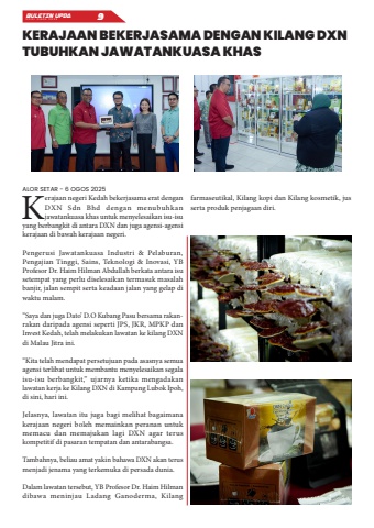BULETIN UPDA EDISI OGOS 2025 9Kerajaan negeri Kedah bekerjasama erat dengan DXN Sdn Bhd dengan menubuhkan jawatankuasa khas untuk menyelesaikan isu-isu yang berbangkit di antara DXN dan juga agensi-agensi kerajaan di bawah kerajaan negeri.Pengerusi Jawatankuasa Industri & Pelaburan, Pengajian Tinggi, Sains, Teknologi & Inovasi, YB Profesor Dr. Haim Hilman Abdullah berkata antara isu setempat yang perlu diselesaikan termasuk masalah banjir, jalan sempit serta keadaan jalan yang gelap di waktu malam.%u201cSaya dan juga Dato%u2019 D.O Kubang Pasu bersama rakanrakan daripada agensi seperti JPS, JKR, MPKP dan Invest Kedah, telah melakukan lawatan ke kilang DXN di Malau Jitra ini.%u201cKita telah mendapat persetujuan pada asasnya semua agensi terlibat untuk membantu menyelesaikan segala isu-isu berbangkit,%u201d ujarnya ketika mengadakan lawatan kerja ke Kilang DXN di Kampung Lubok Ipoh, di sini, hari ini.Jelasnya, lawatan itu juga bagi melihat bagaimana kerajaan negeri boleh memainkan peranan untuk memacu dan memajukan lagi DXN agar terus kompetitif di pasaran tempatan dan antarabangsa.Tambahnya, beliau amat yakin bahawa DXN akan terus menjadi jenama yang terkemuka di persada dunia.Dalam lawatan tersebut, YB Profesor Dr. Haim Hilman dibawa meninjau Ladang Ganoderma, Kilang farmaseutikal, Kilang kopi dan Kilang kosmetik, jus serta produk penjagaan diri.KERAJAAN BEKERJASAMA DENGAN KILANG DXN TUBUHKAN JAWATANKUASA KHASALOR SETAR - 6 OGOS 2025