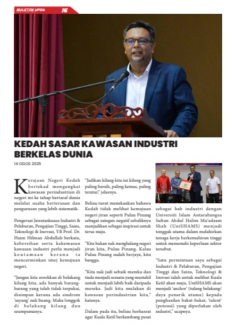 BULETIN UPDA EDISI OGOS 2025 16Kerajaan Negeri Kedah bertekad mengangkat kawasan perindustrian di negeri ini ke tahap bertaraf dunia melalui usaha berterusan dan pengurusan yang lebih sistematik.Pengerusi Jawatankuasa Industri & Pelaburan, Pengajian Tinggi, Sains, Teknologi & Inovasi, YB Prof. Dr. Haim Hilman Abdullah berkata, kebersihan serta kekemasan kawasan industri perlu menjadi k e u t a m a a n k e r a n a i a mencerminkan imej kemajuan negeri.%u201cJangan kita sorokkan di belakang kilang kita, ada banyak barangbarang yang telah tidak terpakai, disimpan kerana ada sindrom %u2018sayang%u2019 nak buang. Maka longgok d i b e l a k a n g k i l a n g d a n seumpamanya.%u201cJadikan kilang kita ini kilang yang paling bersih, paling kemas, paling teratur,%u201d jelasnya.Beliau turut menekankan bahawa Kedah tidak melihat kemajuan negeri jiran seperti Pulau Pinang sebagai saingan negatif sebaliknya menjadikan sebagai inspirasi untuk terus maju.%u201cKita bukan nak menghalang negeri jiran kita, Pulau Pinang. Kalau Pulau Pinang sudah berjaya, kita bangga.%u201cKita nak jadi sebaik mereka dan tiada menjadi sesuatu yang mustahil untuk menjadi lebih baik daripada mereka. Jadi kita mulakan di kawasan perindustrian kita,%u201d katanya.Dalam pada itu, beliau berhasrat agar Kuala Ketil berkembang pesat sebagai hab industri dengan Universiti Islam Antarabangsa Sultan Abdul Halim Mu%u2019adzam Shah (UniSHAMS) menjadi tonggak utama dalam melahirkan tenaga kerja berkemahiran tinggi untuk memenuhi keperluan sektor tersebut.%u201cSatu permintaan saya sebagai Industri & Pelaburan, Pengajian Tinggi dan Sains, Teknologi & Inovasi ialah untuk melihat Kuala Ketil akan maju, UniSHAMS akan menjadi %u2018anchor%u2019 (tulang belakang/daya penarik utama) kepada penghasilan bakat-bakat, %u2018talent%u2019 (potensi) yang diperlukan oleh industri,%u201d ucapnya.KEDAH SASAR KAWASAN INDUSTRI BERKELAS DUNIA14 OGOS 2025