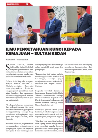 BULETIN UPDA EDISI OGOS 2025 19Su l t a n Ke d a h , S u l t a n Sallehuddin Sultan Badlishah menyeru agar menuntut ilmu perlu diberi perhatian serius dalam membentuk generasi muda yang berkualiti serta berakhlak mulia.Dalam titah Baginda sempena Maj l i s Haf lu Ta k r i m A l M u t a f a w w i q i n , B a g i n d a m e n g i n g a t k a n b a h a w a tanggungjawab pendidikan tidak akan lengkap dan sempurna sekiranya tanggungjawab tersebut diletakkan sepenuhnya kepada para guru di sekolah.%u201cIbu bapa, keluarga, masyarakat dan pelbagai institusi lain perlu bersama-sama bertanggungjawab menggembleng tenaga bagi membantu melengkapkan tugas guru dan tugas sekolah,%u201d titah Baginda.Menerusi usaha itu, Baginda turut mengucapkan setinggi-tinggi penghargaan kepada ibu bapa dan para guru di atas bimbingan dan sokongan yang tidak berbelah bagi dalam mendidik anak-anak dan para pelajar.%u201cPencapaian ini bukan sahaja membanggakan diri sendiri dan k e l u a r g a , t e t a p i j u g a mengharumkan nama baik sekolah, institusi dan negeri Kedah,%u201d titahnya.Baginda bertitah demikian bersempena dengan Majlis Haflu Takrim Al Mutafawwiqin, Lembaga Maktab Mahmud Negeri Kedah Darul Aman yang berlangsung di Dewan Insaniah, Lembaga Zakat Negeri Kedah, hari ini.Pesannya, jadilah insan yang berilmu, berketerampilan serta sentiasa bersedia untuk berbakti kepada agama, bangsa dan negara.%u201cMarilah kita membina budaya kasih sayang, hormat-menghormati dan menolak segala bentuk perbuatan dan amalan yang tidak berakhlak seperti membuli, sama ada secara fizikal atau emosi yang membawa kemudaratan dan masalah kepada semua pihak,%u201d titah Baginda lagi.ILMU PENGETAHUAN KUNCI KEPADA KEMAJUAN %u2013 SULTAN KEDAHALOR SETAR - 19 OGOS 2025