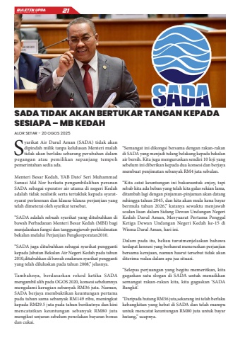 BULETIN UPDA EDISI OGOS 2025 21Syarikat Air Darul Aman (SADA) tidak akan dipindah milik tanpa kelulusan Menteri malah tidak akan berlaku sebarang perubahan dalam pegangan atau pemilikan sepanjang tempoh pemerintahan sedia ada.Menteri Besar Kedah, YAB Dato%u2019 Seri Muhammad Sanusi Md Nor berkata pengambilalihan peranan SADA sebagai operator air utama di negeri Kedah adalah tidak realistik serta tertakluk kepada syaratsyarat perlesenan dan klausa-klausa perjanjian yang telah dimeterai oleh syarikat tersebut.%u201cSADA adalah sebuah syarikat yang ditubuhkan di bawah Perbadanan Menteri Besar Kedah (MBI) bagi menjalankan fungsi dan tanggungjawab perkhidmatan bekalan melalui Perjanjian Pengkorporatan2010.%u201cSADA juga ditubuhkan sebagai syarikat pengganti kepada Jabatan Bekalan Air Negeri Kedah pada tahun 2010,ditubuhkan di bawah enakmen syarikat pengganti yang telah diluluskan pada tahun 2008,%u201d jelasnya.Tambahnya, berdasarkan rekod ketika SADA mengambil alih pada OGOS 2020, konsesi sebelumnya mengalami kerugian sebanyak RM36 juta. Namun, SADA berjaya membuktikan keuntungan pertama pada tahun sama sebanyak RM149 ribu, meningkat kepada RM29.5 juta pada tahun berikutnya dan kini mencatatkan keuntungan sebanyak RM80 juta mengikut unjuran sebelum penolakan bayaran bonus dan cukai.%u201cSemangat ini dikongsi bersama dengan rakan-rakan di SADA yang menjadi tulang belakang kepada bekalan air bersih. Kita juga menguruskan sendiri 10 loji yang sebelum ini diberikan kepada dua konsesi dan berjaya membuat penjimatan sebanyak RM4 juta sebulan.%u201cKita catat keuntungan ini bukanuntuk enjoy, tapi sebab kita ada beban yang telah kita galas sekian lama, ditambah lagi dengan pinjaman-pinjaman akan datang sehingga tahun 2045, dan kita akan mula kena bayar bermula tahun 2026,%u201d katanya sewaktu menjawab soalan lisan dalam Sidang Dewan Undangan Negeri Kedah Darul Aman, Mesyuarat Pertama Penggal Ketiga Dewan Undangan Negeri Kedah ke-15 di Wisma Darul Aman, hari ini.Dalam pada itu, beliau turutmenjelaskan bahawa terdapat konsesi yang berhasrat meneruskan perjanjian bersama kerajaan, namun hasrat tersebut tidak akan diterima walau dalam apa jua situasi.%u201cSelepas perjuangan yang begitu memeritkan, kita gagaskan satu slogan di SADA untuk menaikkan semangat rakan-rakan kita, kita gagaskan %u2018SADA Bangkit%u2019.%u201cDaripada hutang RM36 juta,sekarang ini telah berlaku kebangkitan yang hebat di SADA dan telah mampu untuk mencatat keuntungan RM80 juta untuk bayar hutang,%u201d ucapnya.SADA TIDAK AKAN BERTUKAR TANGAN KEPADA SESIAPA %u2013 MB KEDAHALOR SETAR - 20 OGOS 2025
