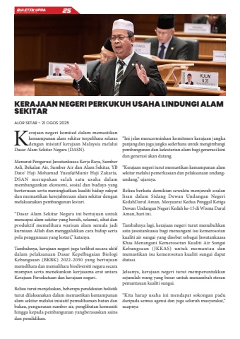 BULETIN UPDA EDISI OGOS 2025 25Kerajaan negeri komited dalam memastikan kemampanan alam sekitar terpelihara selaras dengan inisiatif kerajaan Malaysia melalui Dasar Alam Sekitar Negara (DASN).Menurut Pengerusi Jawatankuasa Kerja Raya, Sumber Asli, Bekalan Air, Sumber Air dan Alam Sekitar, YB Dato%u2019 Haji Mohamad Yusuf@Munir Haji Zakaria, DSAN merupakan salah satu usaha dalam membangunkan ekonomi, sosial dan budaya yang berterusan serta meningkatkan kualiti hidup rakyat dan memastikan kesejahteraan alam sekitar dengan melaksanakan pembangunan lestari.%u201cDasar Alam Sekitar Negara ini bertujuan untuk mencapai alam sekitar yang bersih, selamat, sihat dan produktif memelihara warisan alam semula jadi kurniaan Allah dan menggalakkan cara hidup serta pola penggunaan yang lestari,%u201d katanya.Tambahnya, kerajaan negeri juga terlibat secara aktif dalam pelaksanaan Dasar Kepelbagaian Biologi Kebangsaan (BKBK) 2022-2030 yang bertujuan memelihara dan memulihara biodiversiti negara secara mampan serta menekankan kerjasama erat antara Kerajaan Persekutuan dan kerajaan negeri.Beliau turut menjelaskan, beberapa pendekatan holistik turut dilaksanakan dalam memastikan kemampanan alam sekitar melalui inisiatif pemuliharaan hutan dan bakau, pengurusan sumber air, penglibatan komuniti hingga kepada pembangunan yangberasaskan sains dan pendidikan.%u201cIni jelas mencerminkan komitmen kerajaan jangka panjang dan juga jangka sederhana untuk mengimbangi pembangunan dan kelestarian alam bagi generasi kini dan generasi akan datang.%u201cKerajaan negeri turut memastikan kemampanan alam sekitar melalui pemerkasaan dan pelaksanaan undangundang,%u201d ujarnya.Beliau berkata demikian sewaktu menjawab soalan lisan dalam Sidang Dewan Undangan Negeri KedahDarul Aman, Mesyuarat Kedua Penggal Ketiga Dewan Undangan Negeri Kedah ke-15 di Wisma Darul Aman, hari ini.Tambahnya lagi, kerajaan negeri turut menubuhkan satu jawatankuasa bagi menangani isu kemerosotan kualiti air sungai yang disebut sebagai Jawatankuasa Khas Menangani Kemerosotan Kualiti Air Sungai Kebangsaan (JKKAS) untuk memantau dan memastikan isu kemerosotan kualiti sungai dapat diatasi.Jelasnya, kerajaan negeri turut memperuntukkan sejumlah wang yang besar untuk menambah stesen pemantauan kualiti sungai.%u201cKita harap usaha ini mendapat sokongan padu daripada semua agensi dan juga seluruh masyarakat,%u201d ucapnyaALOR SETAR - 21 OGOS 2025KERAJAAN NEGERI PERKUKUH USAHA LINDUNGI ALAM SEKITAR