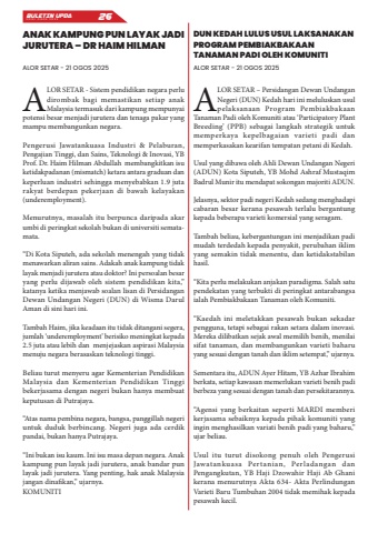 BULETIN UPDA EDISI OGOS 2025 26ALOR SETAR - Sistem pendidikan negara perlu dirombak bagi memastikan setiap anak Malaysia termasuk dari kampung mempunyai potensi besar menjadi jurutera dan tenaga pakar yang mampu membangunkan negara.Pengerusi Jawatankuasa Industri & Pelaburan, Pengajian Tinggi, dan Sains, Teknologi & Inovasi, YB Prof. Dr. Haim Hilman Abdullah membangkitkan isu ketidakpadanan (mismatch) ketara antara graduan dan keperluan industri sehingga menyebabkan 1.9 juta rakyat berdepan pekerjaan di bawah kelayakan (underemployment).Menurutnya, masalah itu berpunca daripada akar umbi di peringkat sekolah bukan di universiti sematamata.%u201cDi Kota Siputeh, ada sekolah menengah yang tidak menawarkan aliran sains. Adakah anak kampung tidak layak menjadi jurutera atau doktor? Ini persoalan besar yang perlu dijawab oleh sistem pendidikan kita,%u201d katanya ketika menjawab soalan lisan di Persidangan Dewan Undangan Negeri (DUN) di Wisma Darul Aman di sini hari ini.Tambah Haim, jika keadaan itu tidak ditangani segera, jumlah %u2018underemployment%u2019 berisiko meningkat kepada 2.5 juta atau lebih dan menjejaskan aspirasi Malaysia menuju negara berasaskan teknologi tinggi.Beliau turut menyeru agar Kementerian Pendidikan Malaysia dan Kementerian Pendidikan Tinggi bekerjasama dengan negeri bukan hanya membuat keputusan di Putrajaya.%u201cAtas nama pembina negara, bangsa, panggillah negeri untuk duduk berbincang. Negeri juga ada cerdik pandai, bukan hanya Putrajaya.%u201cIni bukan isu kaum. Ini isu masa depan negara. Anak kampung pun layak jadi jurutera, anak bandar pun layak jadi jurutera. Yang penting, hak anak Malaysia jangan dinafikan,%u201d ujarnya.KOMUNITIALOR SETAR %u2013 Persidangan Dewan Undangan Negeri (DUN) Kedah hari ini meluluskan usul pelaksanaan Program Pembiakbakaan Tanaman Padi oleh Komuniti atau %u2018Participatory Plant Breeding%u2019 (PPB) sebagai langkah strategik untuk memperkaya kepelbagaian varieti padi dan memperkasakan kearifan tempatan petani di Kedah.Usul yang dibawa oleh Ahli Dewan Undangan Negeri (ADUN) Kota Siputeh, YB Mohd Ashraf Mustaqim Badrul Munir itu mendapat sokongan majoriti ADUN.Jelasnya, sektor padi negeri Kedah sedang menghadapi cabaran besar kerana pesawah terlalu bergantung kepada beberapa varieti komersial yang seragam.Tambah beliau, kebergantungan ini menjadikan padi mudah terdedah kepada penyakit, perubahan iklim yang semakin tidak menentu, dan ketidakstabilan hasil.%u201cKita perlu melakukan anjakan paradigma. Salah satu pendekatan yang terbukti di peringkat antarabangsa ialah Pembiakbakaan Tanaman oleh Komuniti.%u201cKaedah ini meletakkan pesawah bukan sekadar pengguna, tetapi sebagai rakan setara dalam inovasi. Mereka dilibatkan sejak awal memilih benih, menilai sifat tanaman, dan membangunkan varieti baharu yang sesuai dengan tanah dan iklim setempat,%u201d ujarnya.Sementara itu, ADUN Ayer Hitam, YB Azhar Ibrahim berkata, setiap kawasan memerlukan varieti benih padi berbeza yang sesuai dengan tanah dan persekitarannya.%u201cAgensi yang berkaitan seperti MARDI memberi kerjasama sebaiknya kepada pihak komuniti yang ingin menghasilkan variati benih padi yang baharu,%u201d ujar beliau.Usul itu turut disokong penuh oleh Pengerusi Jawatankuasa Pertanian, Perladangan dan Pengangkutan, YB Haji Dzowahir Haji Ab Ghani kerana menurutnya Akta 634- Akta Perlindungan Varieti Baru Tumbuhan 2004 tidak memihak kepada pesawah kecil.ANAK KAMPUNG PUN LAYAK JADI JURUTERA %u2013 DR HAIM HILMANDUN KEDAH LULUS USUL LAKSANAKAN PROGRAM PEMBIAKBAKAAN TANAMAN PADI OLEH KOMUNITIALOR SETAR - 21 OGOS 2025 ALOR SETAR - 21 OGOS 2025