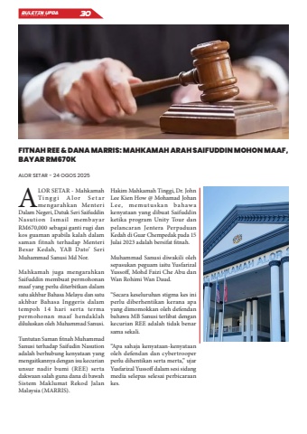 BULETIN UPDA EDISI OGOS 2025 30ALOR SETAR - Mahkamah T i n g g i A l o r S e t a r mengarahkan Menteri Dalam Negeri, Datuk Seri Saifuddin Nasution Ismail membayar RM670,000 sebagai ganti rugi dan kos guaman apabila kalah dalam saman fitnah terhadap Menteri Besar Kedah, YAB Dato%u2019 Seri Muhammad Sanusi Md Nor.Mahkamah juga mengarahkan Saifuddin membuat permohonan maaf yang perlu diterbitkan dalam satu akhbar Bahasa Melayu dan satu akhbar Bahasa Inggeris dalam tempoh 14 hari serta terma permohonan maaf hendaklah diluluskan oleh Muhammad Sanusi.Tuntutan Saman fitnah Muhammad Sanusi terhadap Saifudin Nasution adalah berhubung kenyataan yang mengaitkannya dengan isu kecurian unsur nadir bumi (REE) serta dakwaan salah guna dana di bawah Sistem Maklumat Rekod Jalan Malaysia (MARRIS).Hakim Mahkamah Tinggi, Dr. John Lee Kien How @ Mohamad Johan Lee, memutuskan bahawa kenyataan yang dibuat Saifuddin ketika program Unity Tour dan pelancaran Jentera Perpaduan Kedah di Guar Chempedak pada 15 Julai 2023 adalah bersifat fitnah.Muhammad Sanusi diwakili oleh sepasukan peguam iaitu Yusfarizal Yussoff, Mohd Faizi Che Abu dan Wan Rohimi Wan Daud.%u201cSecara keseluruhan stigma kes ini perlu diberhentikan kerana apa yang dimomokkan oleh defendan bahawa MB Sanusi terlibat dengan kecurian REE adalah tidak benar sama sekali.%u201cApa sahaja kenyataan-kenyataan oleh defendan dan cybertrooper perlu dihentikan serta merta,%u201d ujar Yusfarizal Yussoff dalam sesi sidang media selepas selesai perbicaraan kes.FITNAH REE & DANA MARRIS: MAHKAMAH ARAH SAIFUDDIN MOHON MAAF, BAYAR RM670KALOR SETAR - 24 OGOS 2025