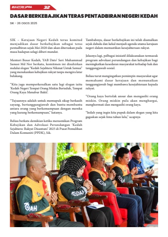 BULETIN UPDA EDISI OGOS 2025 32SIK %u2013 Kerajaan Negeri Kedah terus komited menjadikan dasar berkebajikan sebagai teras pentadbiran sejak Mei 2020 dan akan diteruskan pada masa hadapan selagi diberi mandat.Menteri Besar Kedah, YAB Dato%u2019 Seri Muhammad Sanusi Md Nor berkata, komitmen ini dizahirkan melalui slogan %u201cKedah Sejahtera Nikmat Untuk Semua%u201d yang menekankan kebajikan rakyat tanpa mengira latar belakang.%u201cKita juga memperkenalkan satu lagi slogan iaitu %u2018Kedah Negeri Tempat Orang Miskin Berteduh, Tempat Orang Kaya Menabur Bakti%u2019.%u201cTujuannya adalah untuk memupuk sikap berkasih sayang, bertanggungjawab dan bantu-membantu antara orang yang berkemampuan dengan mereka yang kurang berkemampuan,%u201d katanya.Beliau berkata demikian ketika merasmikan Program Kebajikan dan Advokasi Perundangan %u2018Kedah Sejahtera: Rakyat Disantuni%u2019 2025 di Pusat Pemulihan Dalam Komuniti (PPDK), Sik.Tambahnya, dasar berkebajikan ini telah diamalkan sejak dahulu dan kekal menjadi agenda utama kerajaan negeri dalam memastikan kesejahteraan rakyat.Jelasnya lagi, pelbagai inisiatif dilaksanakan termasuk program advokasi perundangan dan kebajikan bagi meningkatkan kesedaran masyarakat terhadap hak dan tanggungjawab sosial.Beliau turut mengingatkan pemimpin masyarakat agar memahami dasar kerajaan dan menunaikan tanggungjawab bagi membawa kesejahteraan kepada rakyat.%u201cOrang kaya bertolak ansur dan mengasihi orang miskin. Orang miskin pula akan menghargai, menghormati dan mengasihi orang kaya.%u201cInilah yang ingin kita pupuk dalam slogan yang kita gagaskan sejak lima tahun lalu,%u201d ucapnyaDASAR BERKEBAJIKAN TERAS PENTADBIRAN NEGERI KEDAHSIK - 26 OGOS 2025