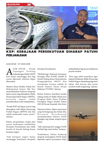 BULETIN UPDA EDISI OGOS 2025 35ALOR SETAR %u2013 Projek L a p a n g a n Te r b a n g Antarabangsa Kulim (KXP) kini hanya menunggu dua lagi syarat dipenuhi sebelum dapat diteruskan.Menteri Besar Kedah, Datuk Seri Muhammad Sanusi Md Nor memaklumkan bahawa daripada lapan syarat yang ditetapkan Majlis Perancang Fizikal Negara (MPFN), k e r a j a a n n e g e r i s u d a h menyelesaikan enam daripadanya.%u201cProjek KXP ada lapan syarat yang ditetapkan oleh Majlis Perancang Fizikal Negara (MPFN) dan kita sudah memenuhi enam syarat,%u201d ujarnya.Beliau menjelaskan, kedua-dua syarat berkenaan melibatkan Kerajaan Persekutuan dan tidak berada di bawah bidang kuasa kerajaan negeri.%u201cJadi kerajaan negeri hanya menunggu komitmen daripada Kerajaan Persekutuan.%u201cBerbaki lagi, National Aerospace Strategic Plan (NASP) adalah di bawah bidang kuasa Kementerian Pengangkutan (MOT) dan Aerodrome Licence adalah di bawah Tentera Udara Diraja Malaysia (TUDM),%u201d ulasnya.Beliau berkata demikian ketika sidang media di Majlis Pelancaran Program Bakti Siswa Perdana Peringkat Negeri Kedah Tahun 2025 di Dewan Insaniah, Alor Setar.Menurut beliau, dalam mesyuarat yang berlangsung dua bulan lalu, K e r a j a a n P e r s e k u t u a n memaklumkan bahawa NASP dijangka siap dalam tempoh lapan bulan.%u201cJadi sekarang kita tunggu NASP berbaki lagi enam bulan,%u201d katanya.Tambahnya, beliau berharap tempoh menyiapkan NASP dapat dipatuhi seperti perjanjian tanpa melambatkan lagi proses kelulusan projek tersebut.%u201cKita juga telah memohon agar tempoh kelulusan Majlis Perancang Fizikal Negara disambung lagi lima tahun oleh kerana dua syarat tersebut masih tergantung,%u201d ujarnya.KXP: KERAJAAN PERSEKUTUAN DIHARAP PATUHI PERJANJIANALOR SETAR - 27 OGOS 2025