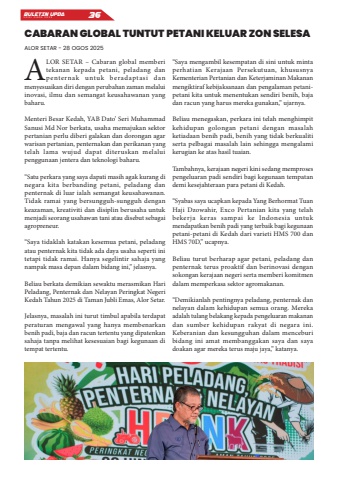 BULETIN UPDA EDISI OGOS 2025 36ALOR SETAR %u2013 Cabaran global memberi tekanan kepada petani, peladang dan penternak untuk beradaptasi dan menyesuaikan diri dengan perubahan zaman melalui inovasi, ilmu dan semangat keusahawanan yang baharu.Menteri Besar Kedah, YAB Dato%u2019 Seri Muhammad Sanusi Md Nor berkata, usaha memajukan sektor pertanian perlu diberi galakan dan dorongan agar warisan pertanian, penternakan dan perikanan yang telah lama wujud dapat diteruskan melalui penggunaan jentera dan teknologi baharu.%u201cSatu perkara yang saya dapati masih agak kurang di negara kita berbanding petani, peladang dan penternak di luar ialah semangat keusahawanan. Tidak ramai yang bersungguh-sungguh dengan keazaman, kreativiti dan disiplin berusaha untuk menjadi seorang usahawan tani atau disebut sebagai agropreneur.%u201cSaya tidaklah katakan kesemua petani, peladang atau penternak kita tidak ada daya usaha seperti ini tetapi tidak ramai. Hanya segelintir sahaja yang nampak masa depan dalam bidang ini,%u201d jelasnya.Beliau berkata demikian sewaktu merasmikan Hari Peladang, Penternak dan Nelayan Peringkat Negeri Kedah Tahun 2025 di Taman Jubli Emas, Alor Setar.Jelasnya, masalah ini turut timbul apabila terdapat peraturan mengawal yang hanya membenarkan benih padi, baja dan racun tertentu yang dipatenkan sahaja tanpa melihat kesesuaian bagi kegunaan di tempat tertentu.%u201cSaya mengambil kesempatan di sini untuk minta perhatian Kerajaan Persekutuan, khususnya Kementerian Pertanian dan Keterjaminan Makanan mengiktiraf kebijaksanaan dan pengalaman petanipetani kita untuk menentukan sendiri benih, baja dan racun yang harus mereka gunakan,%u201d ujarnya.Beliau menegaskan, perkara ini telah menghimpit kehidupan golongan petani dengan masalah ketiadaan benih padi, benih yang tidak berkualiti serta pelbagai masalah lain sehingga mengalami kerugian ke atas hasil tuaian.Tambahnya, kerajaan negeri kini sedang memproses pengeluaran padi sendiri bagi kegunaan tempatan demi kesejahteraan para petani di Kedah.%u201cSyabas saya ucapkan kepada Yang Berhormat Tuan Haji Dzowahir, Exco Pertanian kita yang telah bekerja keras sampai ke Indonesia untuk mendapatkan benih padi yang terbaik bagi kegunaan petani-petani di Kedah dari varieti HMS 700 dan HMS 70D,%u201d ucapnya.Beliau turut berharap agar petani, peladang dan penternak terus proaktif dan berinovasi dengan sokongan kerajaan negeri serta memberi komitmen dalam memperkasa sektor agromakanan.%u201cDemikianlah pentingnya peladang, penternak dan nelayan dalam kehidupan semua orang. Mereka adalah tulang belakang kepada pengeluaran makanan dan sumber kehidupan rakyat di negara ini. Keberanian dan kesungguhan dalam menceburi bidang ini amat membanggakan saya dan saya doakan agar mereka terus maju jaya,%u201d katanya.CABARAN GLOBAL TUNTUT PETANI KELUAR ZON SELESAALOR SETAR - 28 OGOS 2025