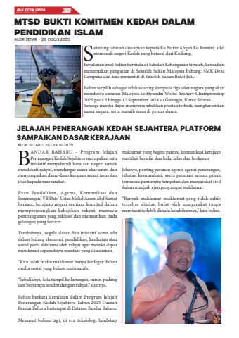 BULETIN UPDA EDISI OGOS 2025 38Sekalung tahniah diucapkan kepada Ku Nurin Afiqah Ku Ruzaini, atlet memanah negeri Kedah yang berasal dari Kodiang.Perjalanan awal beliau bermula di Sekolah Kebangsaan Siputeh, kemudian meneruskan pengajian di Sekolah Sukan Malaysia Pahang, SMK Desa Cempaka dan kini menuntut di Sekolah Sukan Bukit Jalil.Beliau terpilih sebagai salah seorang daripada tiga atlet negara yang akan membawa cabaran Malaysia ke Hyundai World Archery Championship 2025 pada 5 hingga 12 September 2024 di Gwangju, Korea Selatan.Semoga mereka dapat mempersembahkan prestasi terbaik, mengharumkan nama negara, serta meraih emas di pentas dunia.MTSD BUKTI KOMITMEN KEDAH DALAM PENDIDIKAN ISLAMJELAJAH PENERANGAN KEDAH SEJAHTERA PLATFORM SAMPAIKAN DASAR KERAJAANALOR SETAR - 28 OGOS 2025ALOR SETAR - 29 OGOS 2025BANDAR BAHARU - Program Jelajah Penerangan Kedah Sejahtera merupakan satu inisiatif menyeluruh kerajaan negeri untuk mendekati rakyat, mendengar suara akar umbi dan menyampaikan dasar-dasar kerajaan secara terus dan jelas kepada masyarakat.Exco Pendidikan, Agama, Komunikasi dan Penerangan, YB Dato%u2019 Ustaz Mohd Azam Abd Samat berkata, kerajaan negeri sentiasa komited dalam memperjuangkan kebajikan rakyat, memacu pembangunan yang inklusif dan memastikan tiada golongan yang tercicir.Tambahnya, segala dasar dan inisiatif sama ada dalam bidang ekonomi, pendidikan, kesihatan atau sosial perlu difahami oleh rakyat agar mereka dapat menikmati sepenuhnya manfaat yang disediakan.%u201cKita tidak mahu maklumat hanya berlegar dalam media sosial yang belum tentu sahih.%u201cSebaliknya, kita tampil ke lapangan, turun padang dan berjumpa sendiri dengan rakyat,%u201d ujarnya.Beliau berkata demikian dalam Program Jelajah Penerangan Kedah Sejahtera Tahun 2025 Daerah Bandar Baharu bertempat di Dataran Bandar Baharu.Menurut beliau lagi, di era teknologi landskap maklumat yang begitu pantas, komunikasi kerajaan mestilah bersifat dua hala, telus dan berkesan.Jelasnya, penting peranan agensi-agensi penerangan, jabatan komunikasi, serta peranan semua pihak termasuk pemimpin tempatan dan masyarakat sivil dalam menjadi ejen penyampai maklumat.%u201cBanyak maklumat%u2013maklumat yang tidak sahih tersebar ditelan bulat oleh masyarakat tanpa menyiasat terlebih dahulu kesahihannya,%u201d kata beliau.