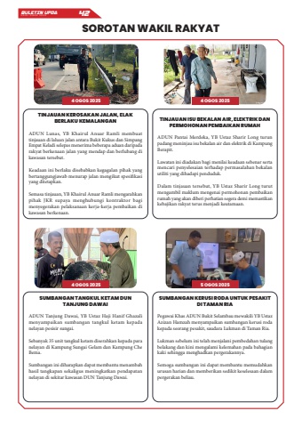 BULETIN UPDA EDISI OGOS 2025 42SOROTAN WAKIL RAKYAT4 OGOS 2025 5 OGOS 2025TINJAUAN ISU BEKALAN AIR, ELEKTRIK DAN PERMOHONAN PEMBAIKAN RUMAHADUN Pantai Merdeka, YB Ustaz Sharir Long turun padang meninjau isu bekalan air dan elektrik di Kampung Berapit.Lawatan ini diadakan bagi menilai keadaan sebenar serta mencari penyelesaian terhadap permasalahan bekalan utiliti yang dihadapi penduduk.Dalam tinjauan tersebut, YB Ustaz Sharir Long turut mengambil maklum mengenai permohonan pembaikan rumah yang akan diberi perhatian segera demi memastikan kebajikan rakyat terus menjadi keutamaan.SUMBANGAN KERUSI RODA UNTUK PESAKIT DI TAMAN RIAPegawai Khas ADUN Bukit Selambau mewakili YB Ustaz Azizan Hamzah menyampaikan sumbangan kerusi roda kepada seorang pesakit, saudara Lukman di Taman Ria.Lukman sebelum ini telah menjalani pembedahan tulang belakang dan kini mengalami kelemahan pada bahagian kaki sehingga menghadkan pergerakannya.Semoga sumbangan ini dapat membantu memudahkan urusan harian dan memberikan sedikit keselesaan dalam pergerakan beliau.TINJAUAN KEROSAKAN JALAN, ELAK BERLAKU KEMALANGANADUN Lunas, YB Khairul Anuar Ramli membuat tinjauan di laluan jalan antara Bukit Kukus dan Simpang Empat Keladi selepas menerima beberapa aduan daripada rakyat berkenaan jalan yang mendap dan berlubang di kawasan tersebut.Keadaan ini berlaku disebabkan kegagalan pihak yang bertanggungjawab menurap jalan mengikut spesifikasi yang ditetapkan.Semasa tinjauan, YB Khairul Anuar Ramli mengarahkan pihak JKR supaya menghubungi kontraktor bagi menyegerakan pelaksanaan kerja-kerja pembaikan di kawasan berkenaan.SUMBANGAN TANGKUL KETAM DUN TANJUNG DAWAIADUN Tanjung Dawai, YB Ustaz Haji Hanif Ghazali menyampaikan sumbangan tangkul ketam kepada nelayan pesisir sungai.Sebanyak 35 unit tangkul ketam diserahkan kepada para nelayan di Kampung Sungai Gelam dan Kampung Che Bema.Sumbangan ini diharapkan dapat membantu menambah hasil tangkapan sekaligus meningkatkan pendapatan nelayan di sekitar kawasan DUN Tanjung Dawai.4 OGOS 2025 4 OGOS 2025
