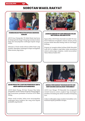 BULETIN UPDA EDISI OGOS 2025 47SOROTAN WAKIL RAKYAT12 OGOS 202513 OGOS 202512 OGOS 202518 OGOS 2025JAMUAN MINUM PETANG BERSAMA KELAB MOTOSIKAL HELANG PUTIHPegawai Khas ADUN Kuah, Faiz Kadir mewakili YB Amar Pared Mahamud menghadiri jamuan minum petang bersama Kelab Motosikal Helang Putih di GM Burger, Kelibang.Program ini mengalu-alukan ketibaan Kelab Motosikal Soulz MC ke Langkawi yang bukan sahaja menyokong industri pelancongan tempatan, malah merancakkan Tahun Melawat Kedah 2025.ADUN AYER HANGAT SELESAIKAN ISU AIR BERTAKUNG DAN SALIRAN TERSUMBATADUN Ayer Hangat, YB Shamsilah Siru mengambil inisiatif menyewa jentera jengkaut bagi menangani masalah air bertakung dan saliran tersumbat di Kampung Yooi.Usaha ini diharapkan dapat memberi kemudahan serta keselesaan kepada penduduk setempat.SUMBANGAN PRIHATIN KEPADA MANGSA BANJIRADUN Guar Chempedak, YB Abdul Ghafar Saad turun ke Kampung Keda Sungai Udang bagi meninjau keadaan banjir dan menyampaikan sumbangan kepada mangsa terjejas.Sebanyak 15 buah rumah terkesan akibat banjir yang melanda. Diharapkan sumbangan ini dapat meringankan beban mereka yang terjejas.ADUN PRIHATIN: SANTUNI PENDUDUK SERTA MENYAMPAIKAN SUMBANGAADUN Bukit Pinang, YB Dato%u2019 Romani Wan Salim mengadakan ziarah di sekitar Kampung Tanjung Inggeris bagi menyantuni penduduk di kawasan DUN Bukit Pinang.Dalam ziarah tersebut, beliau turut menyampaikan sumbangan Beras Sejahtera dan wang tunai kepada penduduk yang diziarahi.