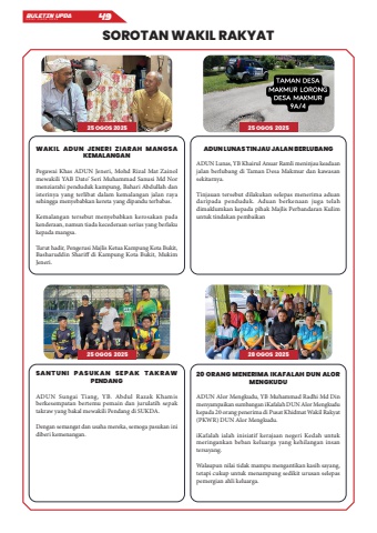 BULETIN UPDA EDISI OGOS 2025 49SOROTAN WAKIL RAKYAT25 OGOS 202525 OGOS 202525 OGOS 202528 OGOS 2025ADUN LUNAS TINJAU JALAN BERLUBANGADUN Lunas, YB Khairul Anuar Ramli meninjau keadaan jalan berlubang di Taman Desa Makmur dan kawasan sekitarnya.Tinjauan tersebut dilakukan selepas menerima aduan daripada penduduk. Aduan berkenaan juga telah dimaklumkan kepada pihak Majlis Perbandaran Kulim untuk tindakan pembaikan20 ORANG MENERIMA IKAFALAH DUN ALOR MENGKUDUADUN Alor Mengkudu, YB Muhammad Radhi Md Din menyampaikan sumbangan iKafalah DUN Alor Mengkudu kepada 20 orang penerima di Pusat Khidmat Wakil Rakyat (PKWR) DUN Alor Mengkudu.iKafalah ialah inisiatif kerajaan negeri Kedah untuk meringankan beban keluarga yang kehilangan insan tersayang.Walaupun nilai tidak mampu mengantikan kasih sayang, tetapi cukup untuk menampung sedikit urusan selepas pemergian ahli keluarga.WAKIL ADUN JENERI ZIARAH MANGSA KEMALANGANPegawai Khas ADUN Jeneri, Mohd Rizal Mat Zainol mewakili YAB Dato%u2019 Seri Muhammad Sanusi Md Nor menziarahi penduduk kampung, Bahari Abdullah dan isterinya yang terlibat dalam kemalangan jalan raya sehingga menyebabkan kereta yang dipandu terbabas.Kemalangan tersebut menyebabkan kerosakan pada kenderaan, namun tiada kecederaan serius yang berlaku kepada mangsa.Turut hadir, Pengerusi Majlis Ketua Kampung Kota Bukit, Basharuddin Shariff di Kampung Kota Bukit, Mukim Jeneri.S A N T U N I P A S U K A N S E P A K T A K R A W PENDANGADUN Sungai Tiang, YB. Abdul Razak Khamis berkesempatan bertemu pemain dan jurulatih sepak takraw yang bakal mewakili Pendang di SUKDA.Dengan semangat dan usaha mereka, semoga pasukan ini diberi kemenangan.