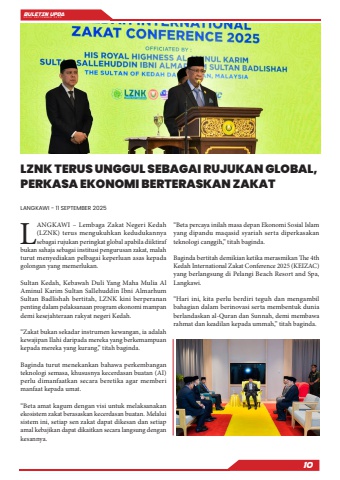 BULETIN UPDA EDISI SEPTEMBER 202510LANGKAWI %u2013 Lembaga Zakat Negeri Kedah (LZNK) terus mengukuhkan kedudukannya sebagai rujukan peringkat global apabila diiktiraf bukan sahaja sebagai institusi pengurusan zakat, malah turut menyediakan pelbagai keperluan asas kepada golongan yang memerlukan.Sultan Kedah, Kebawah Duli Yang Maha Mulia Al Aminul Karim Sultan Sallehuddin Ibni Almarhum Sultan Badlishah bertitah, LZNK kini berperanan penting dalam pelaksanaan program ekonomi mampan demi kesejahteraan rakyat negeri Kedah.%u201cZakat bukan sekadar instrumen kewangan, ia adalah kewajipan Ilahi daripada mereka yang berkemampuan kepada mereka yang kurang,%u201d titah baginda.Baginda turut menekankan bahawa perkembangan teknologi semasa, khususnya kecerdasan buatan (AI) perlu dimanfaatkan secara beretika agar memberi manfaat kepada umat.%u201cBeta amat kagum dengan visi untuk melaksanakan ekosistem zakat berasaskan kecerdasan buatan. Melalui sistem ini, setiap sen zakat dapat dikesan dan setiap amal kebajikan dapat dikaitkan secara langsung dengan kesannya.%u201cBeta percaya inilah masa depan Ekonomi Sosial Islam yang dipandu maqasid syariah serta diperkasakan teknologi canggih,%u201d titah baginda.Baginda bertitah demikian ketika merasmikan The 4th Kedah International Zakat Conference 2025 (KEIZAC) yang berlangsung di Pelangi Beach Resort and Spa, Langkawi.%u201cHari ini, kita perlu berdiri teguh dan mengambil bahagian dalam berinovasi serta membentuk dunia berlandaskan al-Quran dan Sunnah, demi membawa rahmat dan keadilan kepada ummah,%u201d titah baginda.LZNK TERUS UNGGUL SEBAGAI RUJUKAN GLOBAL, PERKASA EKONOMI BERTERASKAN ZAKATLANGKAWI - 11 SEPTEMBER 2025