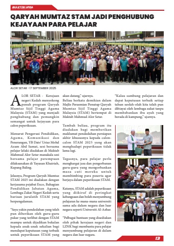 BULETIN UPDA EDISI SEPTEMBER 202513QARYAH MUMTAZ STAM JADI PENGHUBUNG KEJAYAAN PARA PELAJARALOR SETAR -17 SEPTEMBER 2025ALOR SETAR - Kerajaan negeri Kedah menyokong penuh program Qaryah Mumtaz Sijil Tinggi Agama Malaysia (STAM) yang menjadi penghubung dan pemangkin semangat untuk kejayaan para calon peperiksaan.Menurut Pengerusi Pendidikan, Ag am a , Komu n i k a s i d an Penerangan, YB Dato%u2019 Ustaz Mohd Azam Abd Samat, sesi bersama pelajar lelaki diadakan di Maktab Mahmud Alor Setar manakala sesi bersama pelajar perempuan dilaksanakan di Yayasan Khairiah, Kupang Baling.Jelasnya, Program Qaryah Mumtaz STAM 2025 ini diadakan dengan kerjasama pejabat Exco, Bahagian Pendidikan Jabatan Agama, Lembaga Zakat Negeri Kedah serta barisan jurulatih STAM yang berpengalaman.%u201cSaya yakin pendedahan yang telah pun diberikan oleh guru-guru pakar yang terlibat dengan STAM mampu untuk dijadikan bekalan kepada anak-anak sekalian bagi mendapat keputusan yang terbaik untuk peperiksaan STAM yang akan datang,%u201d ujarnya.Beliau berkata demikian dalam Majlis Perasmian Penutup Qaryah Mumtaz Sijil Tinggi Agama Malaysia (STAM) bertempat di Maktab Mahmud Alor Setar.Tambah beliau, program itu diadakan bagi memberikan maklumat pendedahan persiapan akhir khususnya kepada caloncalon STAM 2025 yang akan menghadapi peperiksaan tidak lama lagi.Tegasnya, para pelajar perlu menghargai jasa dan pengorbanan guru-guru yang mengorbankan mas a c ut i mereka untu k membimbing para peserta agar berjaya dalam peperiksaan STAM.Katanya, STAM adalah peperiksaan yang diikiraf di peringkat kebangsaan dan boleh menyambung pelajaran ke mana-mana universiti sama ada dalam negara dan luar negara seperti Universiti Al-Azhar.%u201cPelbagai bantuan yang disediakan oleh pihak kerajaan negeri dan LZNK bagi membantu para pelajar menyambung pelajaran di dalam negara dan luar negara.%u201cKalau sambung pelajaran dan dapat keputusan terbaik setiap tahun seolah-olah kita telah pun dibiayai oleh lembaga zakat tanpa membebankan ibu ayah yang berada di kampung,%u201d ujarnya.