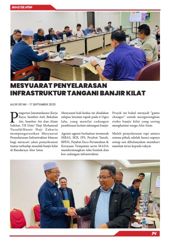 BULETIN UPDA EDISI SEPTEMBER 202514Pengerusi Jawatankuasa Kerja Raya, Sumber Asli, Bekalan Air, Sumber Air dan Alam Sekitar, YB Dato%u2019 Haji Mohamad Yusuf@Munir Haji Zakaria mempengerusikan Mesyuarat Penyelarasan Infrastruktur khusus bagi mencari jalan penyelesaian tuntas terhadap masalah banjir kilat di Bandaraya Alor Setar.Mesyuarat kali kedua ini diadakan selepas lawatan tapak pada 6 Ogos lalu, yang menilai cadangan pembinaan kolam takungan banjir.Agensi-agensi berkaitan termasuk MBAS, JKR, JPS, Pejabat Tanah, BPEN, Pejabat Exco Perumahan & Kerajaan Tempatan serta MADA membentangkan reka bentuk dan kos cadangan infrastruktur.Projek ini bakal menjadi %u201cgame changer%u201d untuk mengurangkan risiko banjir kilat yang sering menghantui warga Alor Setar.Malah penyelarasan rapi antara semua pihak adalah kunci supaya setiap sen dibelanjakan memberi manfaat terus kepada rakyat.MESYUARAT PENYELARASAN INFRASTRUKTUR TANGANI BANJIR KILATALOR SETAR - 17 SEPTEMBER 2025
