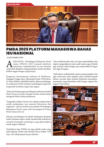BULETIN UPDA EDISI SEPTEMBER 202517ALOR SETAR - Persidangan Mahasiswa Darul Aman (PMDA) 2025 menjadi platform mahasiswa membahaskan isu-isu nasional yang boleh dijadikan sebagai panduan untuk membina sebuah negara bangsa yang berjaya.Pengerusi Jawatankuasa Industri & Pelaburan, Pengajian Tinggi, Sains, Teknologi & Sains, YB Profesor Dr. Haim Hilman Abdullah berkata, dalam persidangan itu mahasiswa boleh memberi pandangan yang kritis yang boleh membina negeri dan negara.%u201cJadi saya berharap agar persidangan mahasiswa Kedah Darul Aman ini akan menjadi medan untuk kalian mengasah bakat-bakat perbahasan.%u201cJanganlah jadikan Dewan ini sebagai tempat hanya untuk melepaskan rasa amarah, kebencian dan segalanya,%u201d ujarnya ketika merasmikan Persidangan Mahasiswa Darul Aman 2025 bertempat di Wisma Darul Aman, hari ini.Jelasnya, persidangan itu adalah sebahagian daripada usaha kerajaan negeri untuk membentuk mahasiswa menjadi pemimpin-pemimpin yang dipersiapkan untuk negara Malaysia.Tambahnya lagi, PMDA itu juga adalah usaha yang telah digarap sendiri oleh Menteri Besar Kedah, YAB Dato%u2019 Seri Muhammad Sanusi Md Nor.%u201cSaya melaksanakan idea ini bagi membolehkan kita dapat mengenalpasti anak-anak muda negeri Kedah agar sentiasa cakna dengan apa yang berlaku di negeri dan juga di negara.%u201cJadi kalian usahakanlah untuk mempersiapkan diri agar suatu hari nanti apabila rakyat melihat kepada kalian, mereka akan melihat kalianlah pemimpinpemimpin yang dinantikan oleh bangsa, agama dan negara,%u201d kata beliau.PMDA 2025 PLATFORM MAHASISWA BAHAS ISU NASIONAL 22 SEPTEMBER 2025