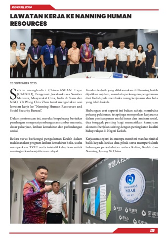 BULETIN UPDA EDISI SEPTEMBER 202518LAWATAN KERJA KE NANNING HUMAN RESOURCES23 SEPTEMBER 2025Selain menghadiri China-ASEAN Expo (CAEXPO), Pengerusi Jawatankuasa Sumber Manusia, Masyarakat Cina, India & Siam dan NGO, YB Wong Chia Zhen turut mengadakan sesi lawatan kerja ke %u201cNanning Human Resources and Social Security Bureau%u201d.Dalam pertemuan ini, mereka berpeluang bertukar pandangan mengenai pembangunan sumber manusia, dasar pekerjaan, latihan kemahiran dan perlindungan sosial.Beliau turut berkongsi pengalaman Kedah dalam melaksanakan program latihan kemahiran belia, usaha memperkasa TVET serta inisiatif kebajikan untuk meningkatkan kesejahteraan rakyat.Amalan terbaik yang dilaksanakan di Nanning boleh dijadikan rujukan, manakala perkongsian pengalaman dari Kedah pula membuka ruang kerjasama dua hala yang lebih kukuh.Hubungan erat seperti ini bukan sahaja membuka peluang pelaburan, tetapi juga memperluas kerjasama dalam pembangunan modal insan dan jaminan sosial, dua tonggak penting bagi memastikan kemajuan ekonomi berjalan seiring dengan peningkatan kualiti hidup rakyat di Negeri Kedah.Kerjasama seperti ini mampu memberi manfaat timbal balik kepada kedua-dua pihak serta memperkukuh hubungan persahabatan antara Kulim, Kedah dan Nanning, Guang Xi China.