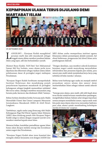 BULETIN UPDA EDISI SEPTEMBER 202520LANGKAWI %u2013 Kerajaan Kedah mengiktiraf peranan mufti dan ahli muzakarah sebagai tonggak utama dalam memberi panduan hukum Islam yang tepat, adil dan berlandaskan syariah.Menteri Besar Kedah, YAB Dato%u2019 Seri Muhammad Sanusi Md Nor berkata, suara ulama perlu terus diperkasa dan dihormati sebagai rujukan utama dalam pelaksanaan dasar di peringkat negeri mahupun Persekutuan.%u201cKerajaan Negeri Kedah beriltizam memperkukuh Institusi Kefatwaan dan mendukung penuh penyelarasan keputusan muzakarah di peringkat kebangsaan sebagai langkah memastikan wehdatul fikri terus subur, sekaligus membina masyarakat yang bersatu padu, harmoni, dan dirahmati Allah,%u201d katanya.Beliau berkata demikian ketika berucap pada Majlis Mawaddah Ulama%u2019 dan Umara%u2019 sempena Mesyuarat Jawatankuasa Muzakarah (MKI) di Aloft Hotel, Langkawi.Tambahnya, segala usaha yang dirancang oleh Majlis Kebangsaan Bagi Hal Ehwal Agama Islam Malaysia (MKI) akan disokong penuh oleh Kerajaan Negeri Kedah selagi ia selaras dengan maqasid syariah serta memberi manfaat kepada umat Islam.Menurut beliau, kestabilan pentadbiran agama Islam hanya akan dicapai melalui sinergi dan koordinasi antara negeri dan Persekutuan.%u201cKerajaan Negeri Kedah akan terus komited dan mengalu-alukan kerjasama erat dengan JAKIM dan MKI dalam usaha memperkasa institusi agama khususnya dalam pemantapan akidah ummah, hal ehwal kefatwaan, pengurusan hal ehwal Islam serta pembangunan dakwah.%u201cDengan demikian, saya memberi seluruh komitmen kerajaan negeri untuk menyokong menyediakan infrastruktur dan prasarana kepada para ulama, para umara%u2019, para mufti untuk menjalankan kerja-kerja yang terbeban di bahu mereka,%u201d jelasnya.Beliau turut berharap agar usaha ini menjadi simbol perpaduan antara ulama dan umara%u2019 demi memartabatkan Islam sebagai rahmat untuk seluruh alam.%u201cSemoga para ulama, para mufti, ahli-ahli feqah akan terus berani untuk bersuara memberikan pandangan, mengistbatkan hukum-hukum selari dengan keperluan semasa ataupun mendahului zaman, supaya anak-anak kita pada masa depan akan terus merasakan hadirnya para alim ulama untuk membimbing kehidupan mereka di dunia ini,%u201d ucapnya.KEPIMPINAN ULAMA TERUS DIJULANG DEMI MARTABAT ISLAM25 SEPTEMBER 2025