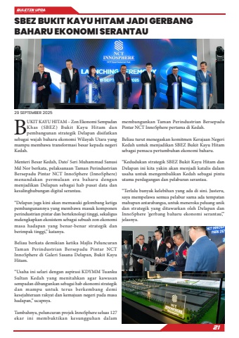 BULETIN UPDA EDISI SEPTEMBER 202521BUKIT KAYU HITAM %u2013 Zon Ekonomi Sempadan Khas (SBEZ) Bukit Kayu Hitam dan pembangunan strategik Delapan disifatkan sebagai wajah baharu ekonomi Wilayah Utara yang mampu membawa transformasi besar kepada negeri Kedah.Menteri Besar Kedah, Dato%u2019 Seri Muhammad Sanusi Md Nor berkata, pelaksanaan Taman Perindustrian Bersepadu Pintar NCT InnoSphere (InnoSphere) menandakan permulaan era baharu dengan menjadikan Delapan sebagai hab pusat data dan kesalinghubungan digital serantau.%u201cDelapan juga kini akan memasuki gelombang ketiga pembangunannya yang membawa masuk komponen perindustrian pintar dan berteknologi tinggi, sekaligus melengkapkan ekosistem sebagai sebuah zon ekonomi masa hadapan yang benar-benar strategik dan berimpak tinggi,%u201d katanya.Beliau berkata demikian ketika Majlis Peluncuran Taman Perindustrian Bersepadu Pintar NCT InnoSphere di Galeri Sasana Delapan, Bukit Kayu Hitam.%u201cUsaha ini selari dengan aspirasi KDYMM Tuanku Sultan Kedah yang menitahkan agar kawasan sempadan dibangunkan sebagai hab ekonomi strategik dan mampu untuk terus berkembang demi kesejahteraan rakyat dan kemajuan negeri pada masa hadapan,%u201d ucapnya.Tambahnya, peluncuran projek InnoSphere seluas 127 ekar ini membuktikan kesungguhan dalam membangunkan Taman Perindustrian Bersepadu Pintar NCT InnoSphere pertama di Kedah.Beliau turut menegaskan komitmen Kerajaan Negeri Kedah untuk menjadikan SBEZ Bukit Kayu Hitam sebagai pemacu pertumbuhan ekonomi baharu.%u201cKedudukan strategik SBEZ Bukit Kayu Hitam dan Delapan ini kita yakin akan menjadi katalis dalam usaha untuk mengembalikan Kedah sebagai pintu utama perdagangan dan pelaburan serantau.%u201cTerlalu banyak kelebihan yang ada di sini. Justeru, saya mempelawa semua pelabur sama ada tempatan mahupun antarabangsa, untuk meneroka peluang unik dan strategik yang ditawarkan oleh Delapan dan InnoSphere %u2018gerbang baharu ekonomi serantau%u2019,%u201d jelasnya.SBEZ BUKIT KAYU HITAM JADI GERBANG BAHARU EKONOMI SERANTAU29 SEPTEMBER 2025