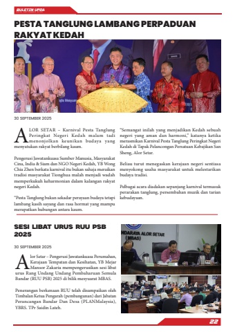 BULETIN UPDA EDISI SEPTEMBER 202522SESI LIBAT URUS RUU PSB 202530 SEPTEMBER 202530 SEPTEMBER 2025Alor Setar %u2013 Pengerusi Jawatankuasa Perumahan, Kerajaan Tempatan dan Kesihatan, YB Mejar Mansor Zakaria mempengerusikan sesi libat urus Rang Undang Undang Pembaharuan Semula Bandar (RUU PSB) 2025 di bilik mesyuarat MBAS.Penerangan berkenaan RUU telah disampaikan oleh Timbalan Ketua Pengarah (pembangunan) dari Jabatan Perancangan Bandar Dan Desa (PLANMalaysia), YBRS. TPr Saidin Lateh.ALOR SETAR %u2013 Karnival Pesta Tanglung Peringkat Negeri Kedah malam tadi menonjolkan keunikan budaya yang menyatukan rakyat berbilang kaum.Pengerusi Jawatankuasa Sumber Manusia, Masyarakat Cina, India & Siam dan NGO Negeri Kedah, YB Wong Chia Zhen berkata karnival itu bukan sahaja meraikan tradisi masyarakat Tionghua malah menjadi wadah memperkukuh keharmonian dalam kalangan rakyat negeri Kedah.%u201cPesta Tanglung bukan sekadar perayaan budaya tetapi lambang kasih sayang dan rasa hormat yang mampu merapatkan hubungan antara kaum.%u201cSemangat inilah yang menjadikan Kedah sebuah negeri yang aman dan harmoni,%u201d katanya ketika merasmikan Karnival Pesta Tanglung Peringkat Negeri Kedah di Tapak Pelancongan Persatuan Kebajikan San Sheng, Alor Setar.Beliau turut menegaskan kerajaan negeri sentiasa menyokong usaha masyarakat untuk melestarikan budaya tradisi.Pelbagai acara diadakan sepanjang karnival termasuk perarakan tanglung, persembahan muzik dan tarian kebudayaan.PESTA TANGLUNG LAMBANG PERPADUAN RAKYAT KEDAH