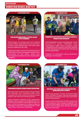 BULETIN UPDA EDISI SEPTEMBER 2025SOROTAN WAKIL RAKYAT252 SEPTEMBER 20252 SEPTEMBER 2025 2 SEPTEMBER 20253 SEPTEMBER 2025PROGRAM ZIARAH ASNAF DUN AYER HITAMADUN Ayer Hitam, YB Azhar Ibrahim bersama PKWR, MKK setempat dan mahasiswa Bakti Siswa menziarahi 40 rumah asnaf di Kampung Tandop Kedabu, Kuala Jerlun dan Kampung Jeruju.Lapan kumpulan dibentuk bagi menyantuni golongan asnaf, warga emas, orang sakit dan uzur, sambil menyampaikan sumbangan.Program ini juga memberi pengalaman langsung kepada mahasiswa untuk turun padang bersama wakil rakyat dalam menyantuni masyarakat.TINJAUAN KERJA MILL & PAVE JALAN DATO KUMBARADUN Derga, YB Muhammad Amri Wahab meninjau kerja-kerja Mill & Pave di Jalan Dato Kumbar yang dilaksanakan JKR Kota Setar bersama BDB Infra Sdn. Bhd.Projek penurapan semula ini penting kerana Jalan Dato Kumbar merupakan laluan utama penduduk ke Alor Setar, sekali gus meningkatkan keselesaan dan keselamatan pengguna.PEMERIKSAAN KESIHATAN DI SALA KECHIL & PERMATANG BONGORADUN Pengkalan Kundor, YB Mardhiyyah Johari bersama Dr. Alyana (PAPISMA) serta mahasiswa Bakti Siswa Perdana 2025 mengadakan pemeriksaan kesihatan kepada warga Kampung Sala Kechil dan Kampung Permatang Bongor.Program ini membuka ruang membantu golongan memerlukan. GOTONG-ROYONG DUN KUBANG ROTAN BERSAMA BAKTI SISWAADUN Kubang Rotan, YB Dato%u2019 Haji Mohd Salleh Saidin menyertai Program Gotong-Royong Bakti Siswa bersama penduduk Pantai Leman dan Persisir Pantai Padang Garam.Program terakhir Bakti Siswa di DUN Kubang Rotan ini berlangsung meriah dengan penglibatan Ahli Parlimen Kuala Kedah, YB Dr Ahmad Fakhruddin Sheikh Fakhrurazi, MBAS, AADK, SWCorp dan Bomba Sukarela Kuala Kedah.