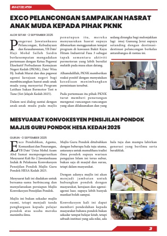 BULETIN UPDA EDISI SEPTEMBER 20253Pengerusi Jawatankuasa Pelancongan, Kebudayaan dan Keusahawanan, YB Dato%u2019 Haji Mohd Salleh Saidin berkesempatan mengadakan pertemuan dengan Ketua Pegawai Eksekutif Perbadanan Kemajuan Negeri Kedah (PKNK), Dato%u2019 Wira Hj. Isahak Murat dan dua pegawai agensi kerajaan negeri bagi membincangkan hasrat anak-anak muda yang menyertai Program Latihan Sukan Bermotor Test n Tune (Siri Jelajah Kedah 2025).Dalam sesi dialog santai dengan anak-anak muda pada majlis p e n u t u p a n i t u , m e r e k a menyuarakan hasrat supaya dibenarkan menggunakan tempat program di kawasan Bukit Kayu Hitam Industrial Fasa 3 sebagai t ap a k s e m e nt ar a a kt i v it i permotoran yang lebih bersifat melatih pada masa akan datang.Alhamdulillah, PKNK memberikan reaksi positif dengan menyatakan ke s e d i a an m e n i mb ang k an permintaan tersebut.Pada pertemuan itu pihak PKNK turut memberi penerangan mengenai rancangan-rancangan yang akan dilaksanakan dan yang sedang dirangka bagi melonjakkan lagi imej Gunung Jerai supaya setanding dengan destinasidestinasi pelancongan berkelas antarabangsa di rantau ini.Exco Pendidikan, Agama, Komunikasi dan Penerangan, YB Dato%u2019 Ustaz Mohd Azam Abd Samat mempengerusikan Mesyuarat Kali Ke-2 Jawatankuasa Induk & Pelaksana Konvokesyen Pensijilan Pondok Majlis Guru Pondok HESA Kedah 2025.Mesyuarat kali ini diadakan untuk bersama-sama berbincang dan menyelaraskan persiapan Majlis Konvokesyen Pensijilan Pondok.Majlis ini bukan sekadar majlis rasmi, tetapi menjadi tanda penghargaan kepada pelajar pondok atas usaha mereka menimba ilmu.Majlis Guru Pondok ditubuhkan dengan beberapa hala tuju utama, antaranya untuk memelihara tradisi ilmu pondok supaya warisan pengajian Islam ini terus subur, bukan saja di masjid dan surau, tetapi dalam masyarakat.Dengan adanya majlis ini akan m e nj a d i j amb at an u ntu k hubungkan pondok dengan masyarakat, kerajaan dan agensiagensi luar, supaya lebih banyak manfaat boleh sampai.Konvokesyen kali ini dapat memberi pendedahan kepada masyarakat bahawa pondok bukan sekadar tempat belajar kitab, tetapi sebuah institusi yang ada nilai, ada hala tuju dan mampu lahirkan generasi yang berilmu serta berakhlak.EXCO PELANCONGAN SAMPAIKAN HASRAT ANAK MUDA KEPADA PIHAK PKNKMESYUARAT KONVOKESYEN PENSIJILAN PONDOK MAJLIS GURU PONDOK HESA KEDAH 2025ALOR SETAR -2 SEPTEMBER 2025GURUN -3 SEPTEMBER 2025